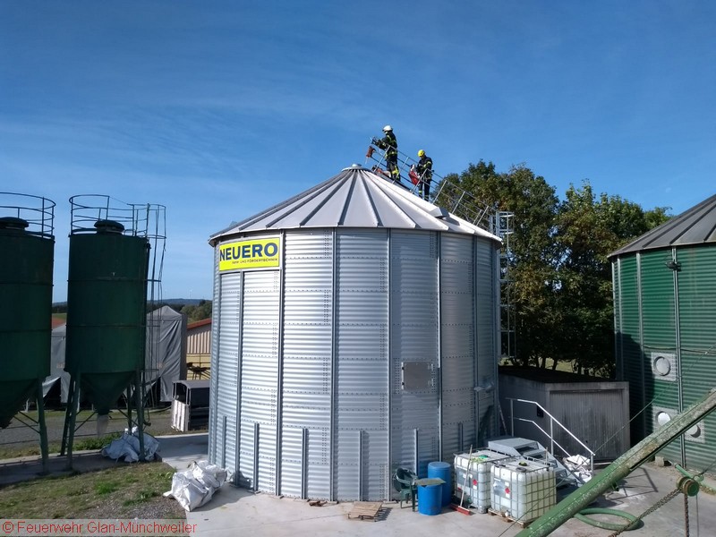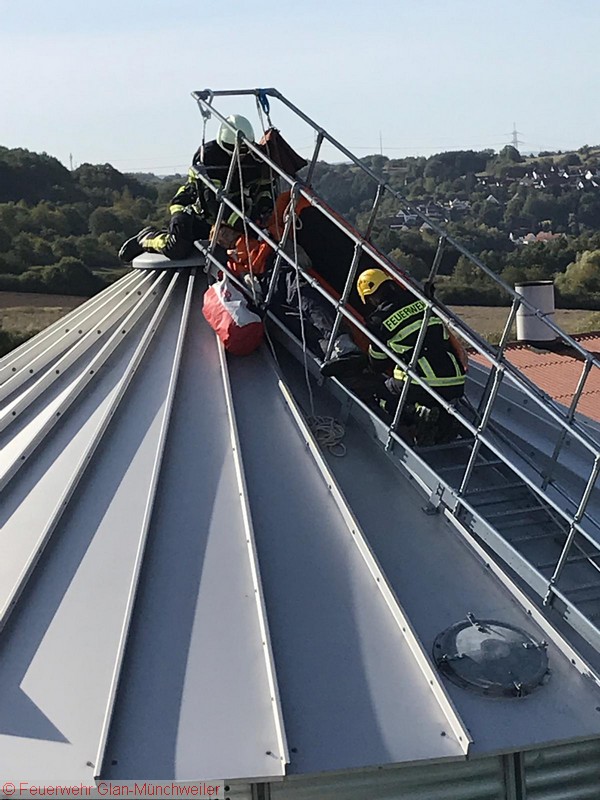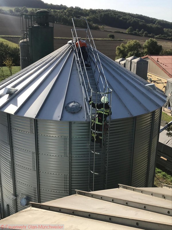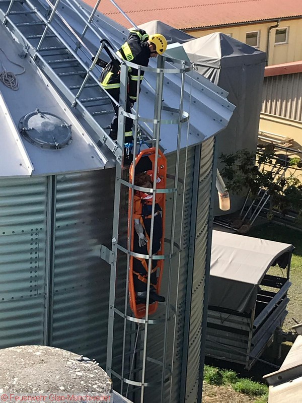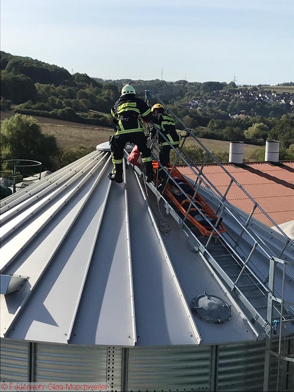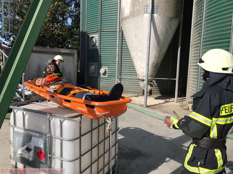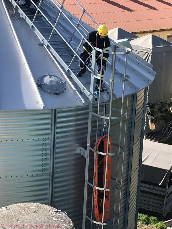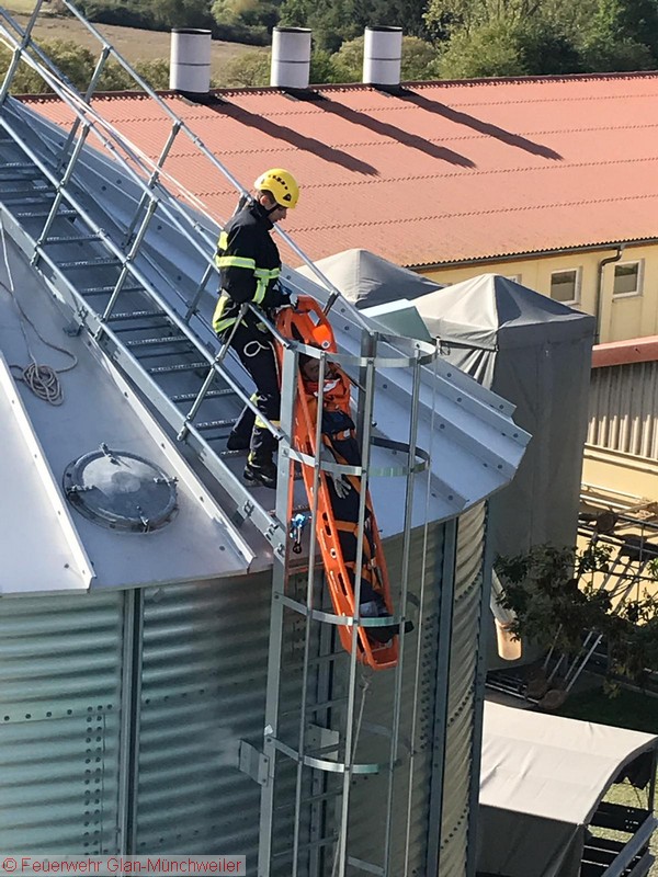 Übungsszenario: Ein Arbeiter war auf einem Silo verunfallt und musste aus der Höhe gerettet werden. Die Aufstellung einer Drehleiter war räumlich bedingt nicht möglich, so dass ein Ablassen mittels Schleifkorbtrage und Rollgliss erforderlich wurde. Die Person konnte schließlich dem Rettungsdienst übergeben werden.