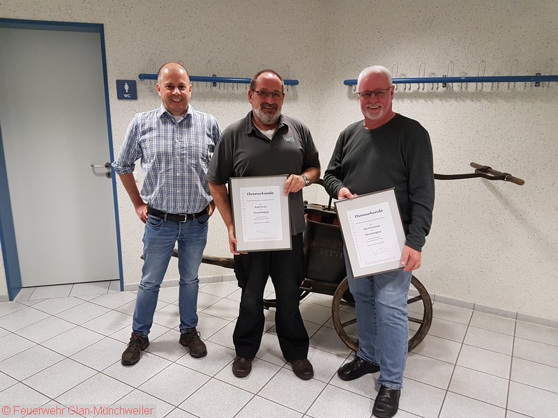 Anlässlich der Jahreshauptversammlung des Feuerwehrvereins Glan-Münchweiler am 22.03.2019 wurden Rudi Pirron und Udo Schmeiser zum Ehrenmitglied des Feuerwehrvereins ernannt. Rudi Pirron begleitet bereits seit der Gründung des Vereins das Amt des 1. Vorsitzenden. Udo Schmeiser war bis zur Verbandsgemeindefusion Wehrleiter der ehemaligen Verbandsgemeinde Glan-Münchweiler und bis zum Erreichen der Altersgrenze Kreisfeuerwehrinspekteur des Landkreises Kusel. Beide haben sich in den vergangenen Jahren überdurchschnittlich für die Belange der Feuerwehr Glan-Münchweiler eingesetzt und werden auch weiterhin als Vorsitzender bzw. Vertreter der Alters- und Ehrenabteilung tätig bleiben.