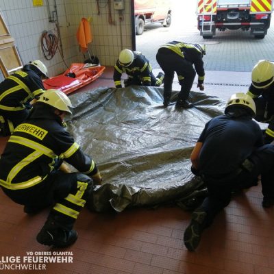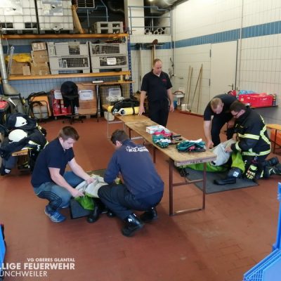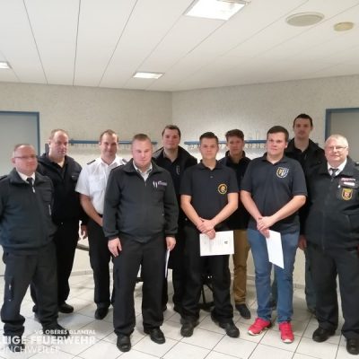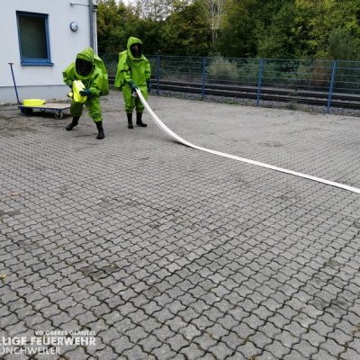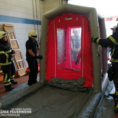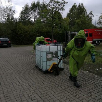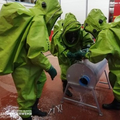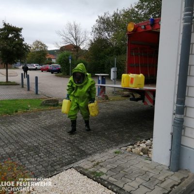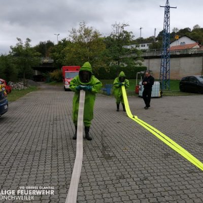 Vom 28.09.2019 bis zum 06.10.2019 fand in der Feuerwehr Glan-Münchweiler der CSA-Träger-Lehrgang für den Landkreis Kusel statt. Das Ausbilderteam, unter der Leitung von Jens Blügel sowie Dietmar Mayer, vermittelte den Teilnehmern in 17 überwiegend praktischen Unterrichtsstunden den Umgang und das Arbeiten unter dem Chemikalienschutzanzug. Die eingeschränkte Beweglichkeit, die erschwerte Sicht und die physisch extreme Anstrengung erschwert die Arbeiten unter diesem schweren Schutzanzug. Es ist auch bei dieser Form der Schutzkleidung nicht mehr möglich, diese alleine an- oder abzulegen, sondern es ist nötig, dass weitere CSA-Träger unterstützen. Die zu bewältigenden Aufgaben wurden sehr einsatzbezogen ausgewählt, so mussten die CSA-Träger zum Beispiel Kanaleinläufe abdichten, auslaufendes Medium umpumpen, Stoffnamen mit Funk übermitteln und die Notfallrettung eines verunglückten CSA-Trägers durchführen.