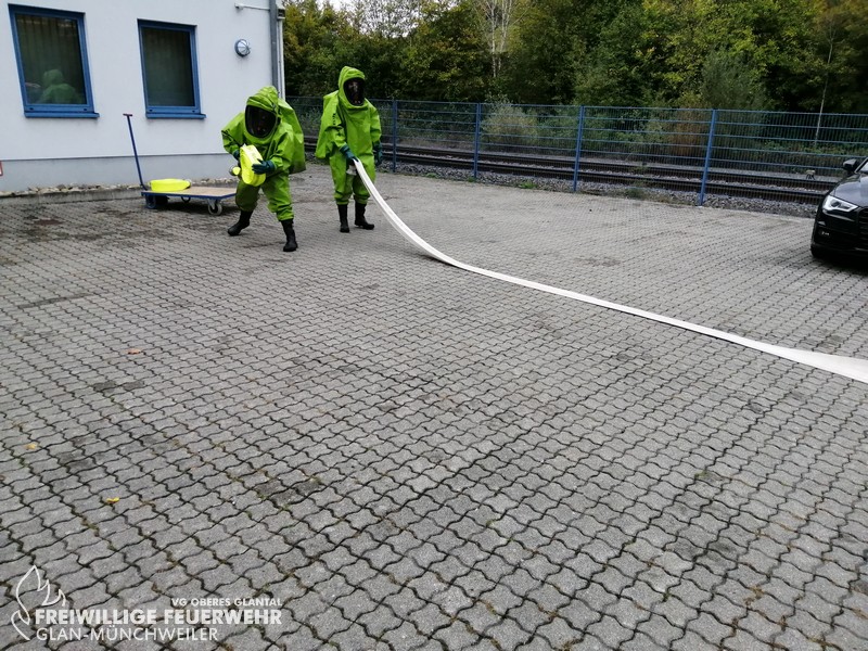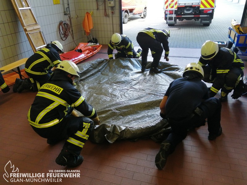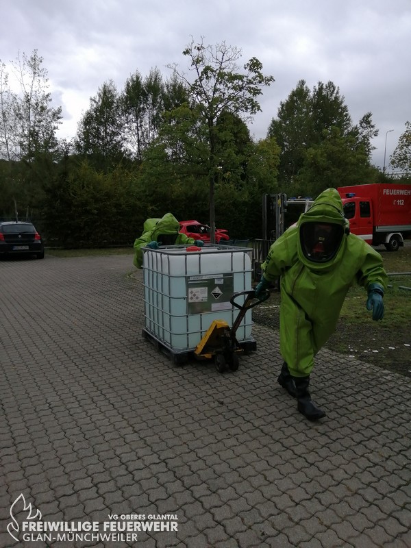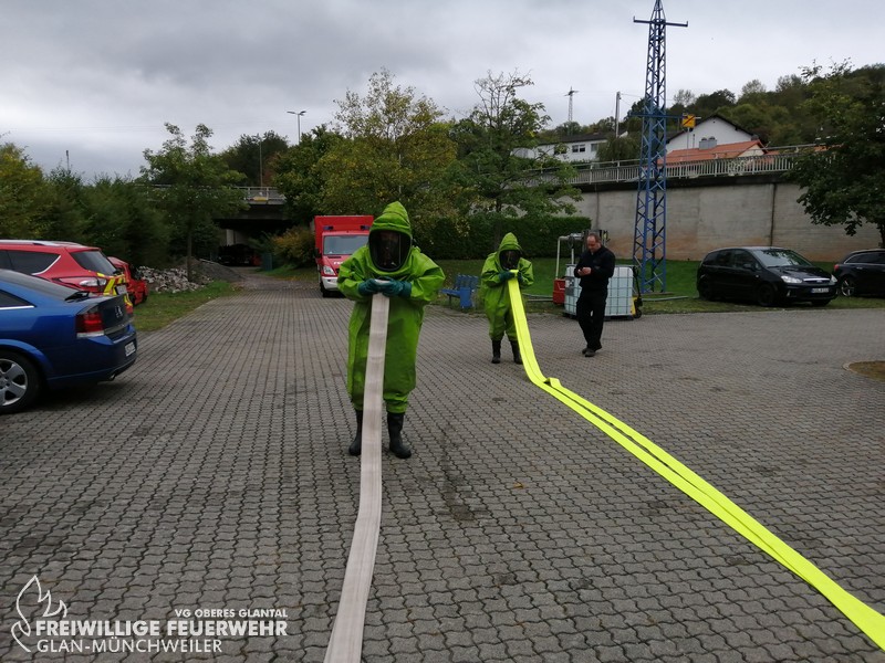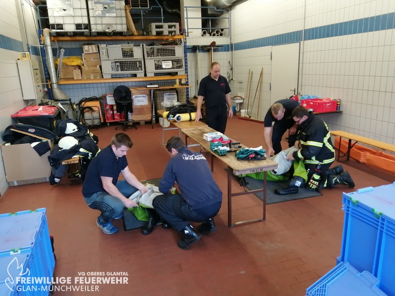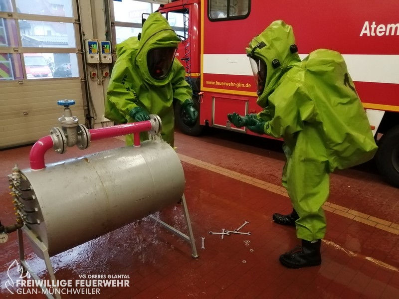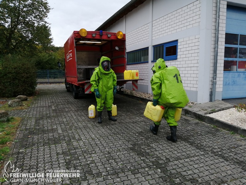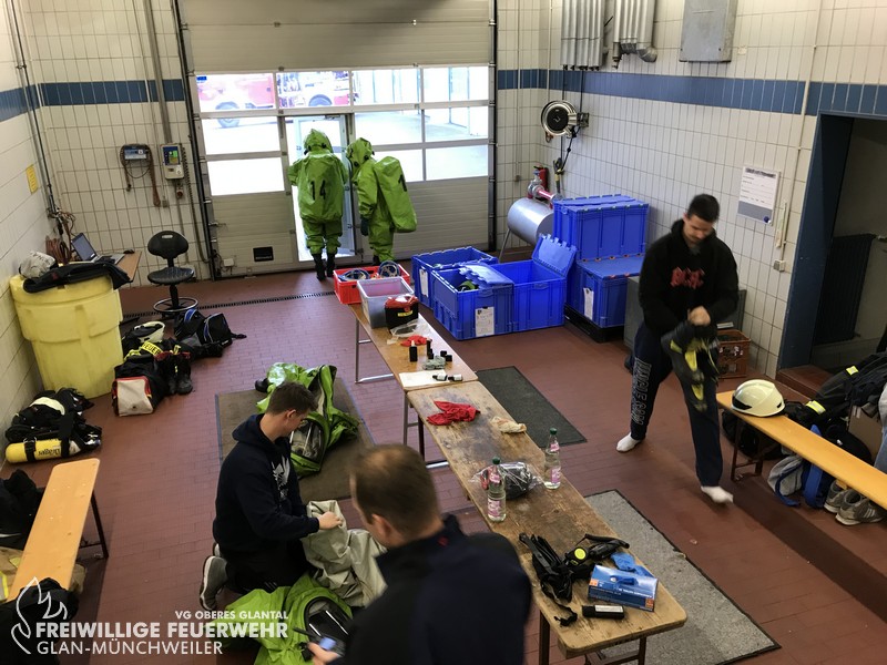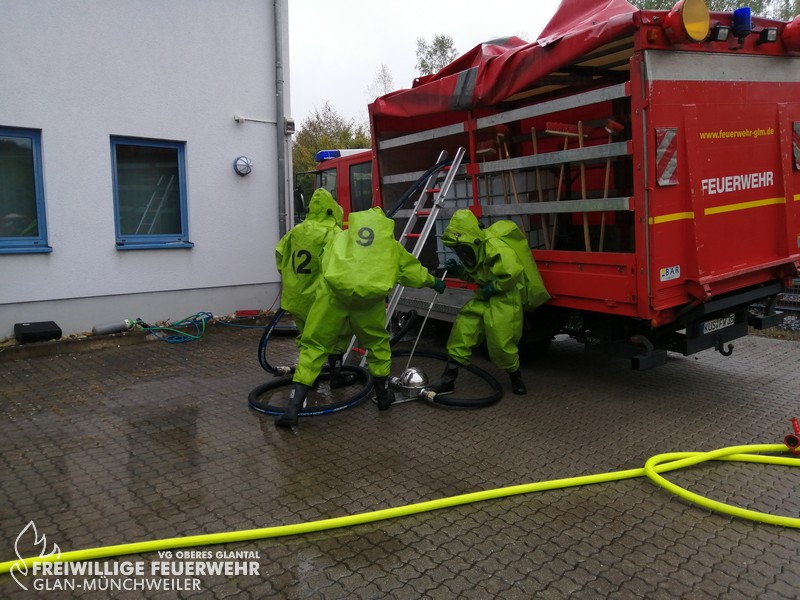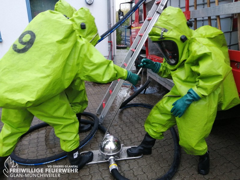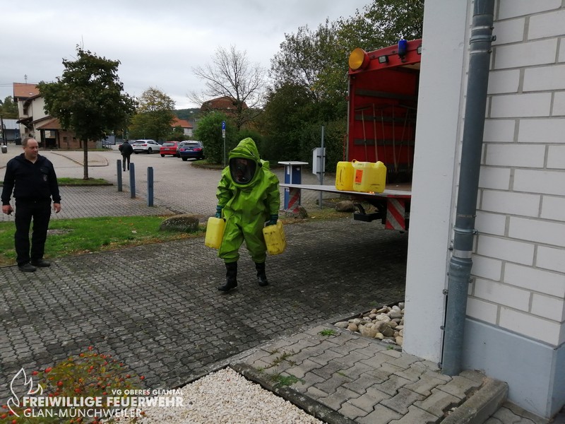 Vom 28.09.2019 bis zum 06.10.2019 fand in der Feuerwehr Glan-Münchweiler der CSA-Träger-Lehrgang für den Landkreis Kusel statt. Das Ausbilderteam, unter der Leitung von Jens Blügel sowie Dietmar Mayer, vermittelte den Teilnehmern in 17 überwiegend praktischen Unterrichtsstunden den Umgang und das Arbeiten unter dem Chemikalienschutzanzug. Die eingeschränkte Beweglichkeit, die erschwerte Sicht und die physisch extreme Anstrengung erschwert die Arbeiten unter diesem schweren Schutzanzug. Es ist auch bei dieser Form der Schutzkleidung nicht mehr möglich, diese alleine an- oder abzulegen, sondern es ist nötig, dass weitere CSA-Träger unterstützen. Die zu bewältigenden Aufgaben wurden sehr einsatzbezogen ausgewählt, so mussten die CSA-Träger zum Beispiel Kanaleinläufe abdichten, auslaufendes Medium umpumpen, Stoffnamen mit Funk übermitteln und die Notfallrettung eines verunglückten CSA-Trägers durchführen.