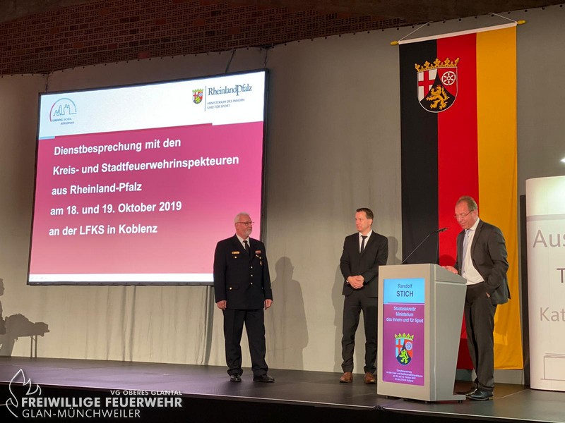 Anlässlich der Dienstbesprechung der Kreis- und Stadtfeuerwehrinspekteure in Koblenz wurde am 18.10.2019 der ehemalige Kreisfeuerwehrinspekteur Udo Schmeiser offiziell von Staatssekretär Randolf Stich verabschiedet.