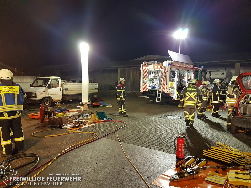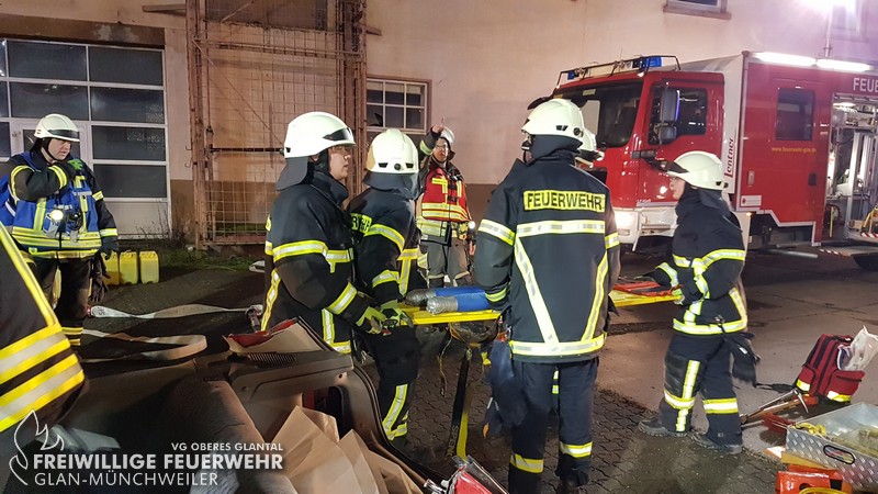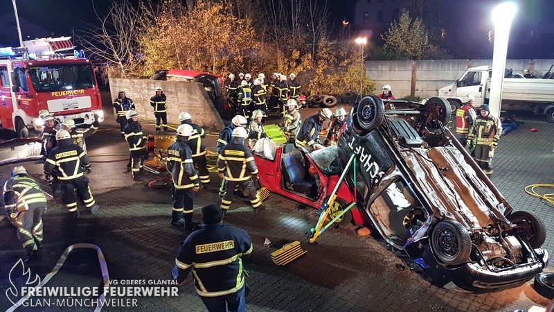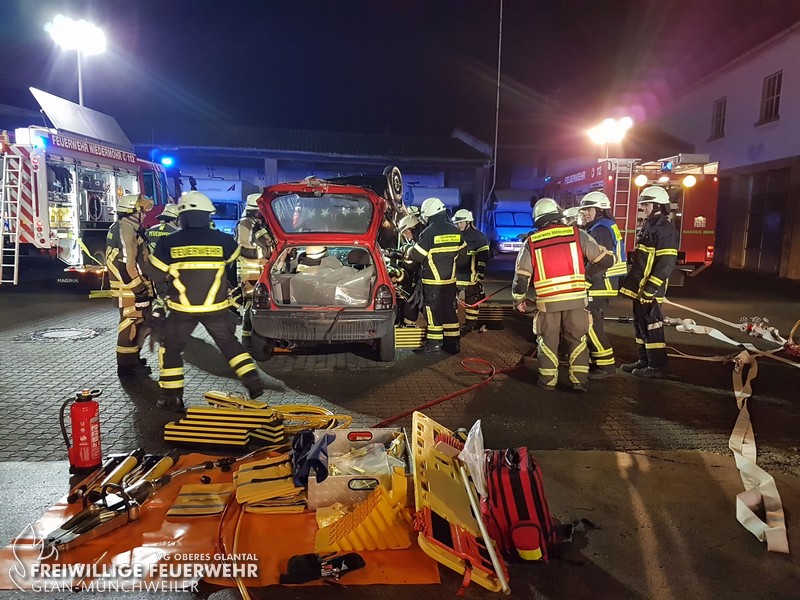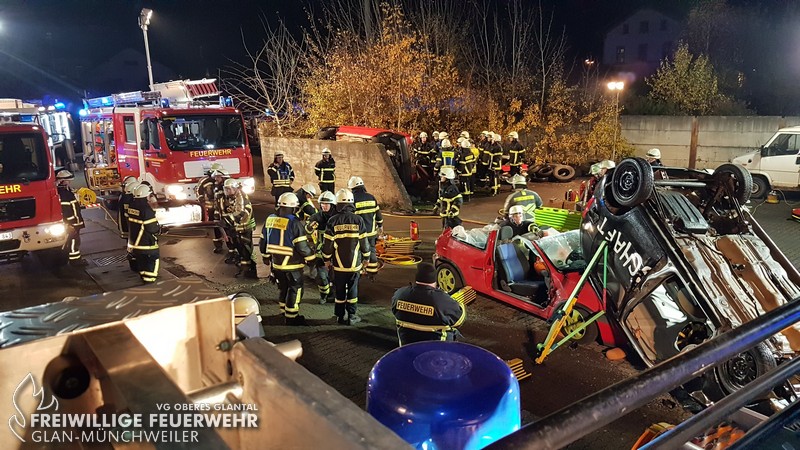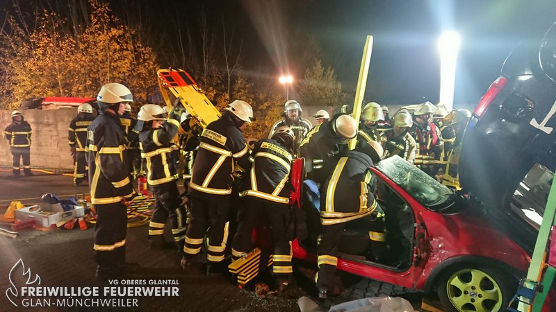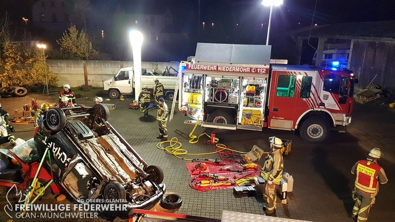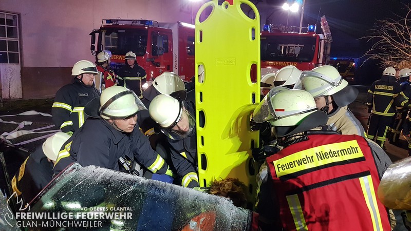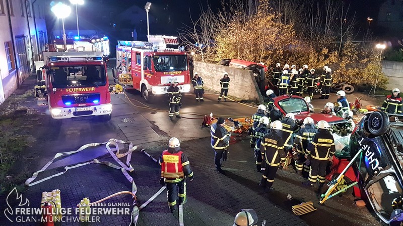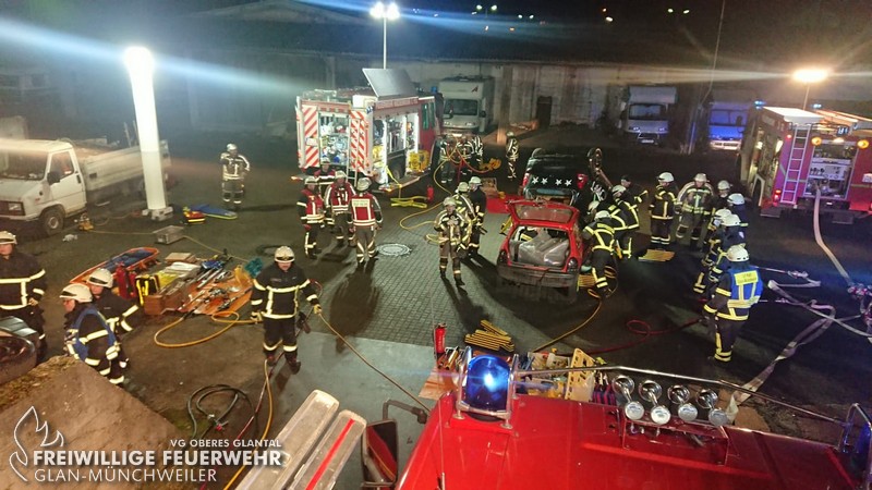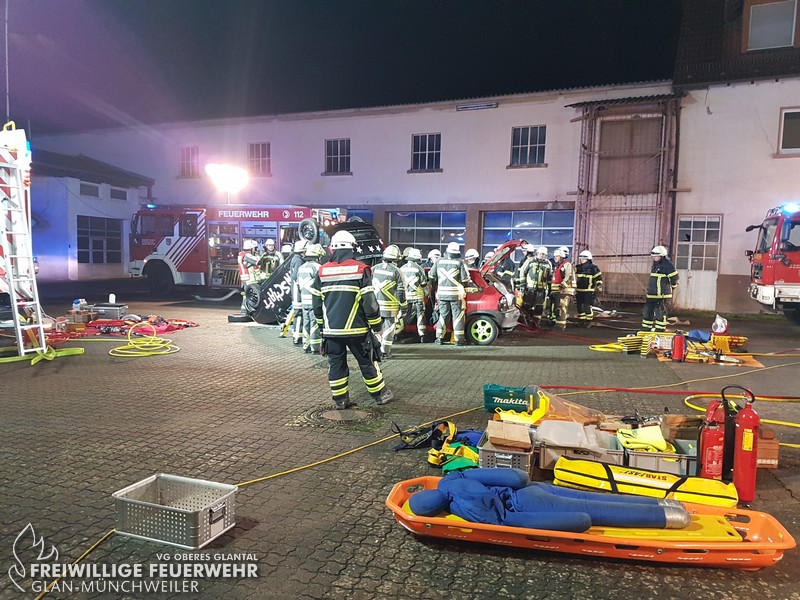 Am Montag den 25.11.2019 fand die jährliche Gemeinschaftsübung der Feuerwehren Glan-Münchweiler und Niedermohr statt. Seit Jahren richtet jede der Feuerwehreinheiten im Wechsel eine Einsatzübung aus, um die Zusammenarbeit zu festigen und somit im Einsatzfall eine reibungslose Abarbeitung der Einsatzlagen zu gewährleisten. In diesem Jahr lag der Schwerpunkt der Übung im Bereich der Technischen Hilfe. Ausgangslage war, dass sich die Feuerwehr Glan-Münchweiler bereits bei einem Einsatz auf der BAB 62 befand und gleichzeitig ein weiterer Verkehrsunfall mit drei Fahrzeugen und mehreren eingeklemmten Personen auf dem ehemaligen Gelände der Baufirma Hanz in Glan-Münchweiler gemeldet wurde.