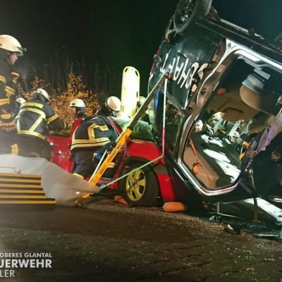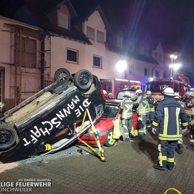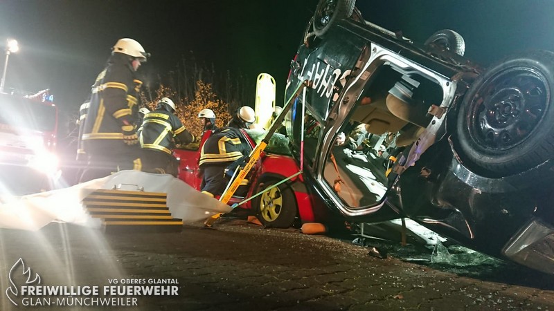 Die Besatzung des Einsatzleitwagens aus Glan-Münchweiler (Einsatzleiter, Führungsassistent, Melder), welcher die erste Einsatzstelle unmittelbar nach der Alarmierung verlassen konnte, führten gemeinsam mit der Feuerwehr Niedermohr die Erkundung der Einsatzstelle durch und priorisierten die vorgefundene Lage. Ein PKW wurde mit einer eingeklemmten Person in Dachlage vorgefunden. Ein zweites Fahrzeug befand sich unter dem Heck des ersten PKW. Auch hier waren der Fahrer sowie ein Kind im hinteren Bereich des Fahrzeuges eingeklemmt. Ein drittes Unfallfahrzeug lag etwas abseits der ersten Einsatzstelle nach mehrfachen Überschlag in Seitenlage an einer Mauer. Der Fahrer des dritten Fahrzeuges war ebenfalls eingeklemmt.