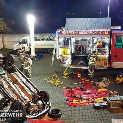 Die Feuerwehr Niedermohr, ausgerückt mit Hilfeleistungslöschgruppenfahrzeug und Tanklöschfahrzeug kümmerte sich primär um die eingeklemmte Person des Fahrzeugs in Dachlage und betreute bis zum Eintreffen der Feuerwehr Glan-Münchweiler die weiteren verletzten Personen. Die beiden ersteintreffenden Fahrzeuge  der Feuerwehr Glan-Münchweiler (Hilfeleistungslöschgruppenfahrzeug und Gerätewagen-Technik) bekamen den PKW in Seitenlage zugewiesen, das nächste Fahrzeug (Löschgruppenfahrzeug KatS) übernahm die Rettung des Fahrers und des eingeklemmten Kindes am dritten PKW. Die Maßnahmen am dritten Fahrzeug wurden gemeinsam mit der Feuerwehr Niedermohr durchgeführt. Durch die Besatzung des Tanklöschfahrzeuges 4000 wurde die Einsatzstelle weiter ausgeleuchtet.
