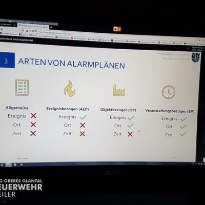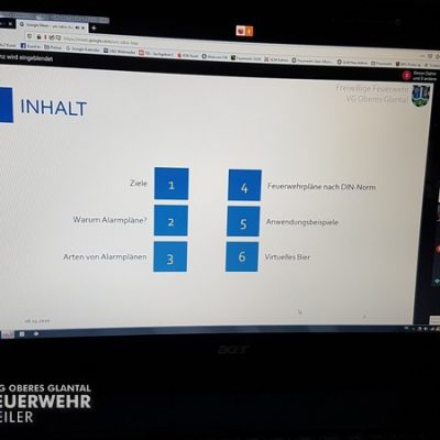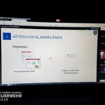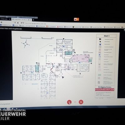 Christian hatte zum Thema „Alarm- und Einsatzpläne / Feuerwehrpläne“ eine einstündige Präsentation vorbereitet, die von allen Teilnehmern zuhause mitverfolgt und kommentiert werden konnte.