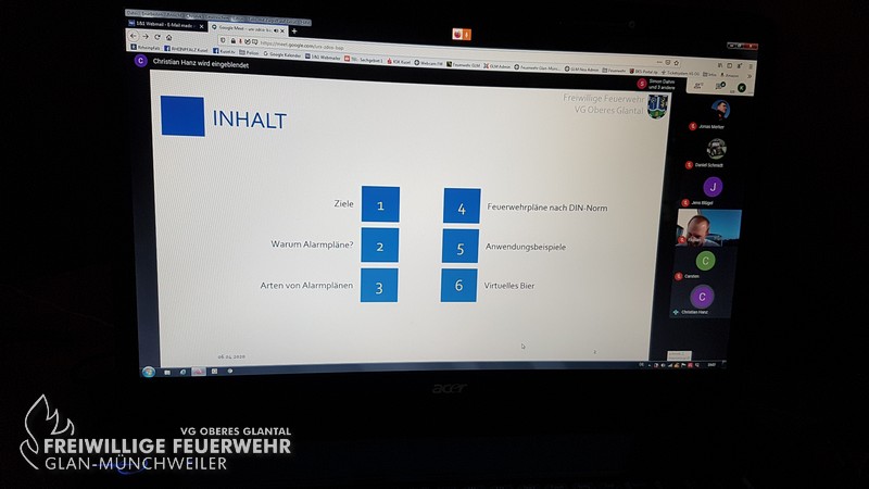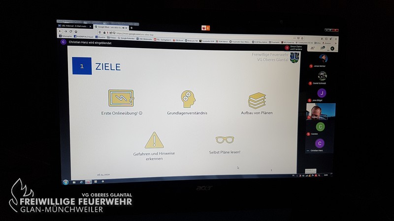 Gestern Abend wurde die erste Online-Ausbildung bei der Feuerwehr Glan-Münchweiler durchgeführt. In den letzten Tagen wurde immer öfter der Wunsch geäußert, trotz der aktuellen Lage, auch weiterhin einen Ausbildungsdienst anzubieten. Christian Hanz hatte sich der Thematik angenommen und für Montagabend 19 Uhr zum ersten Online-Ausbildungsdienst eingeladen. Pünktlich um 19 Uhr begrüßte der Wehrführer per Video-Chat die zugeschalteten Mitglieder der Feuerwehr, informierte über aktuelle Themen und übergab dann das Wort bzw. Bild an den Ausbilder Christian Hanz.