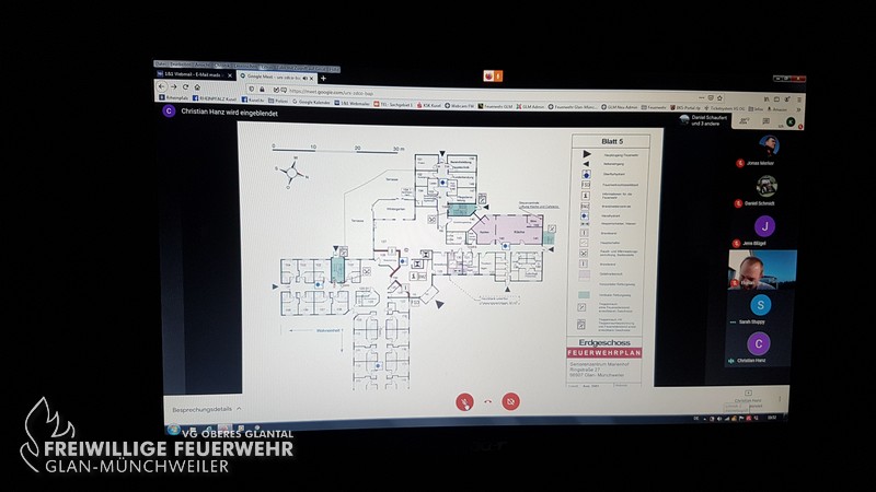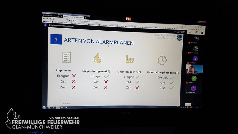 Christian hatte zum Thema „Alarm- und Einsatzpläne / Feuerwehrpläne“ eine einstündige Präsentation vorbereitet, die von allen Teilnehmern zuhause mitverfolgt und kommentiert werden konnte.