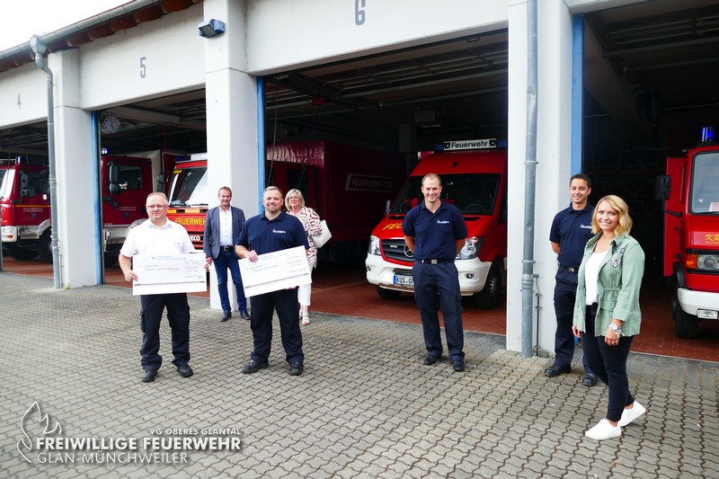 Am Donnerstagabend konnte die Wehrführung Glan-Münchweiler sowie die Wehrleitung der Verbandsgemeinde Oberes Glantal von der Volksbank Glan-Münchweiler eine Spende in Höhe von jeweils 2000€ entgegennehmen. Die Feuerwehr Glan-Münchweiler nutzt das Geld zur Anschaffung einer weiteren Wärmebildkamera für das Löschgruppenfahrzeug (LF KatS).