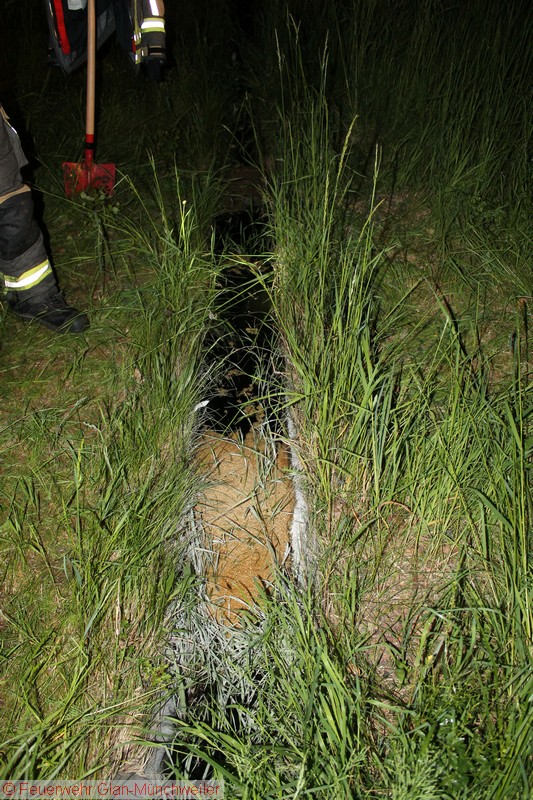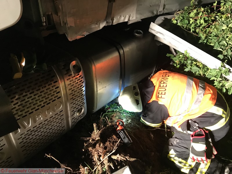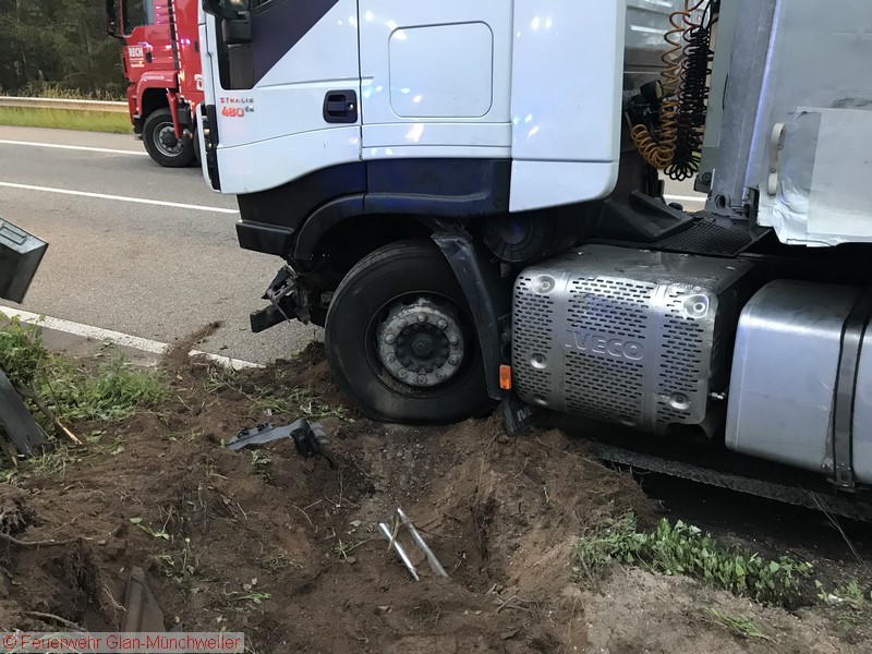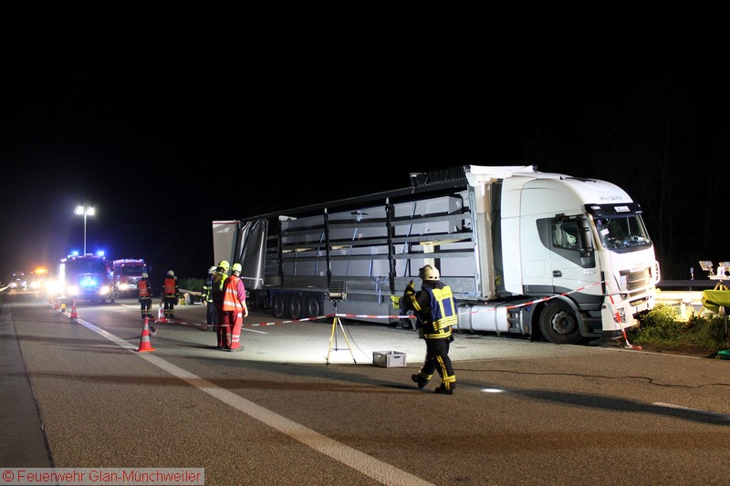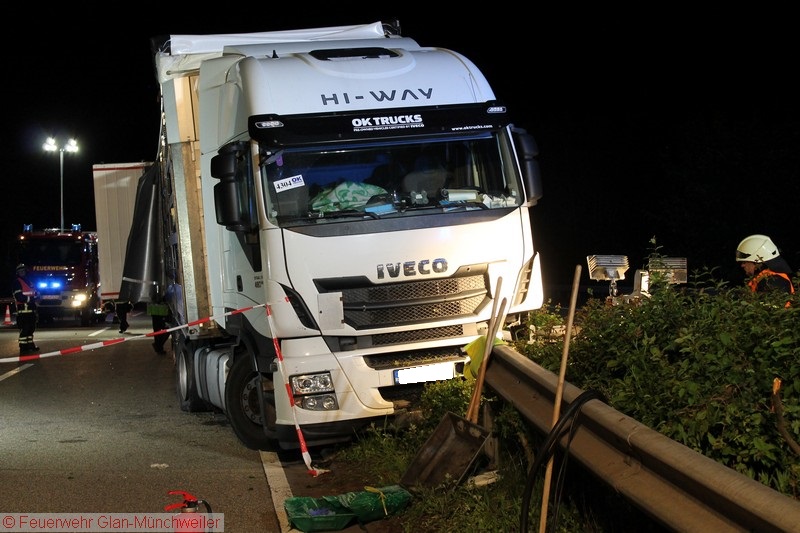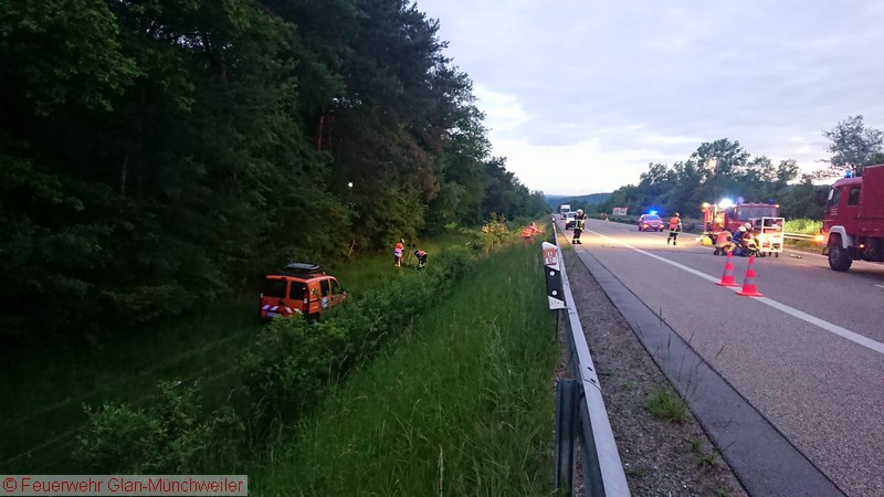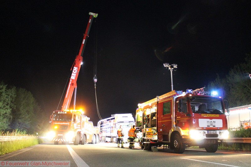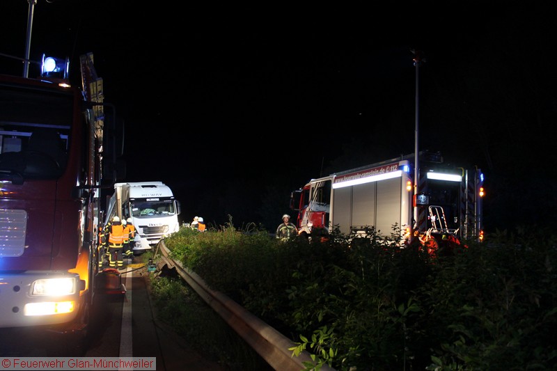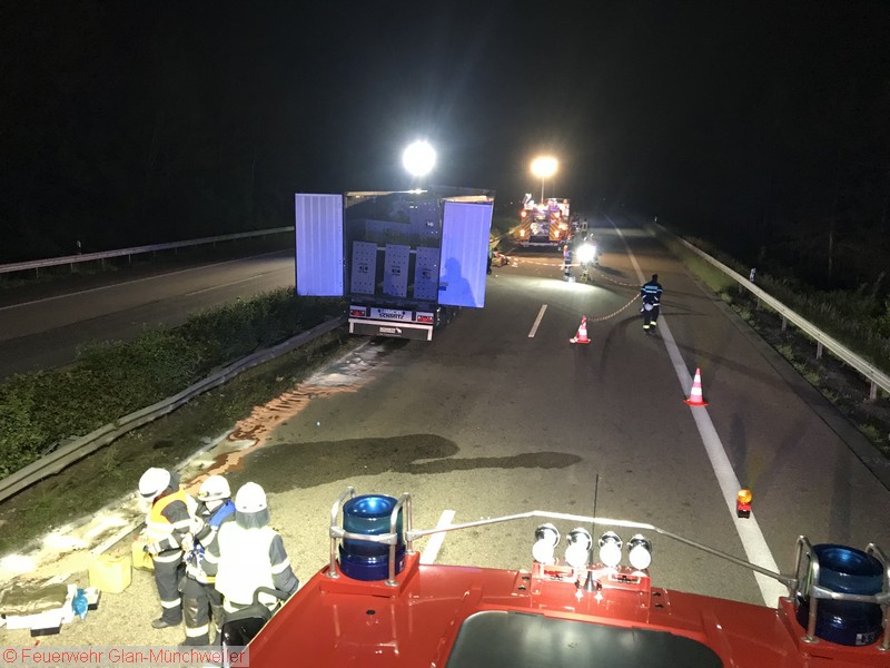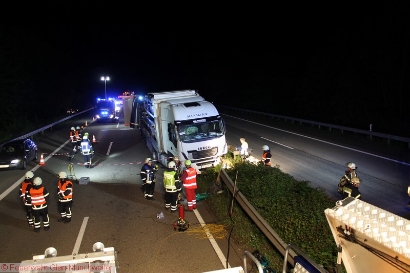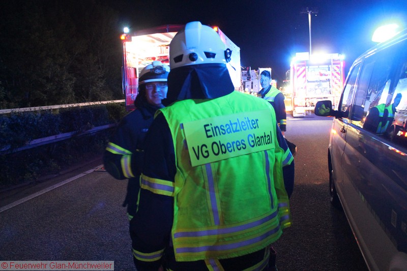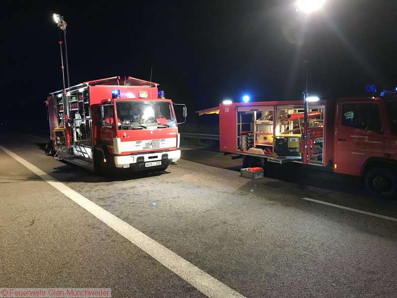 In der Nacht auf Freitag alarmierte die ILS Kaiserslautern auf Anforderung der Polizei die Feuerwehr Glan-Münchweiler aufgrund auslaufender Betriebsstoffe aus einem LKW auf der BAB 62 zwischen den Anschlussstellen Glan-Münchweiler und Hütschenhausen. Ein LKW war aufgrund eines Reifenplatzers in die Mittelleitplanke gefahren und hatte sich dabei den Dieseltank aufgerissen. Als erste Maßnahme wurde der Brandschutz sichergestellt und das im Strahl auslaufende Medium mittels Wannen aufgefangen sowie Kanaleinläufe abgedichtet. Da das Leck nicht zu erreichen war, mussten Teile der Leitplanke und Mittelstreifenbepflanzung herausgeschnitten werden. Zur Absicherung der Arbeiten und weiterer Ausleuchtung wurde die Feuerwehr Ramstein auf die Gegenfahrbahn nachgefordert. Ebenso wurde aufgrund der großen auslaufenden Menge die Gerätegruppe des Gefahrstoffzuges Landkreis Kusel alarmiert. Der Gefahrstoffzug pumpte das im Tank verbliebene Diesel in Behälter um, während die Feuerwehr Niedermohr den Auslauf des Kanals ausfindig machte, in den das Diesel bis zum Eintreffen der Feuerwehr lief. Da sich dieses in einer Länge von 800 m in einer Rinne neben der Autobahn angestaut hatte, wurde ebenfalls durch den Gefahrstoffzug das Medium in Behälter umgepumpt und Reste mit Bindemittel abgestreut.