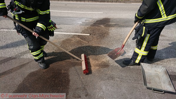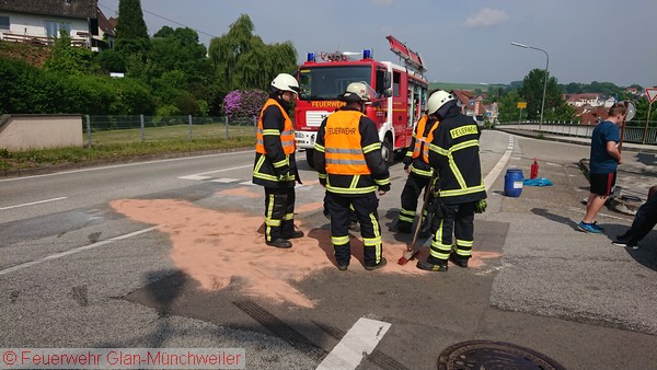 Im Kreuzungsbereich B423 / L 358 liefen ca. 5 Liter Diesel aus einem PKW aus. Die Gefahrenstelle wurde abgesichert, der Brandschutz sichergestellt und das Diesel mit Ölbindemittel aufgenommen.