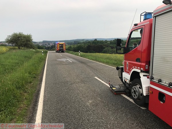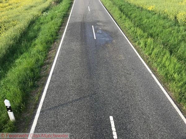 Auf einer Bewegungsfahrt mit dem TLF bemerkte die Besatzung auf der B423 zwischen Steinbach und Brücken einen Traktor mit geplatztem Hydraulikschlauch. Die Hydraulikflüssigkeit war auf beide Fahrstreifen verteilt, so dass kein Passieren mehr möglich war.
