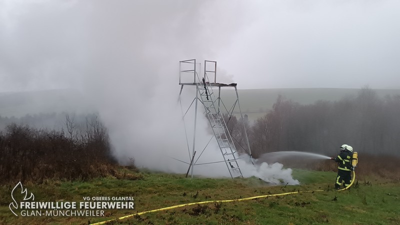 Am Dienstagabend wurde die große Gruppe zum dritten Mal am heutigen Tag alarmiert – gemeinsam mit den Feuerwehren Nanzdietschweiler und Börsborn. In Nanzdietschweiler brannte ein Hochsitz, der sich etwa 150 Meter abseits befestigter Wege befand. Nachdem eine Wasserversorgung über eine längere Wegestrecke zur Einsatzstelle aufgebaut worden war, konnte ein Trupp unter Atemschutz den Brand bekämpfen. Im Anschluss wurde die Einsatzstelle der Polizei übergeben.
