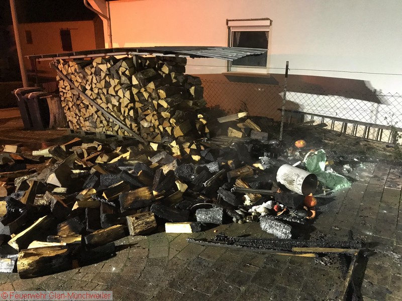 Vor Ort brannte ein Mülleimer sowie teilweise der danebenliegende Holzunterstand. Das Feuer konnte von den Wehren aus Herschweiler-Petersheim und Krottelbach schnell unter Atemschutz abgeschlöscht werden, so dass der ELW und das HLF aus Glan-Münchweiler die Einsatzfahrt abbrechen konnten. Nach Ablöschen letzter Glutnester sowie einer Kontrolle des Daches eines nahe stehenden Wohnhauses wurde die Einsatzstelle der Polizei übergeben.
