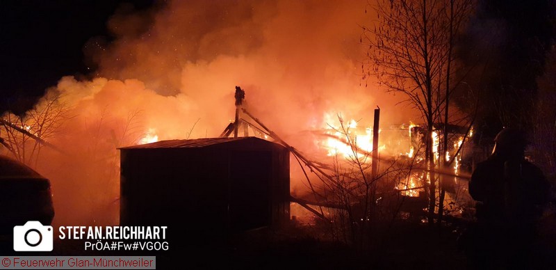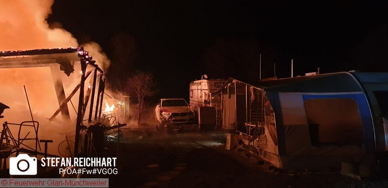 Mehrere Wohnwagen, Vorzelte und Holzverschläge standen in Flammen. Zwei Autos wurden in Mitleidenschaft gezogen. Feuerwehren der Umgebung rückten aus, um die Flammen zu löschen. Aktuell sind keine Personen verletzt. Der Aufenthalt einer Person ist zurzeit nicht bekannt. Die Löscharbeiten sind im Moment eingestellt. Die Feuerwehr hält Brandwache. Brandermittler der Kriminalpolizei sind vor Ort. Die Brandursache ist aktuell nicht geklärt. Laut Schätzung der Polizei dürfte der Sachschaden über 100.000,- Euro liegen.