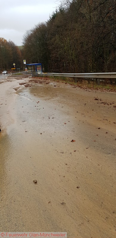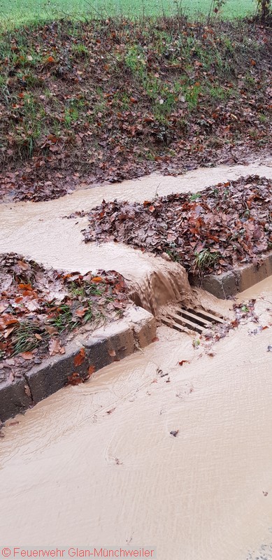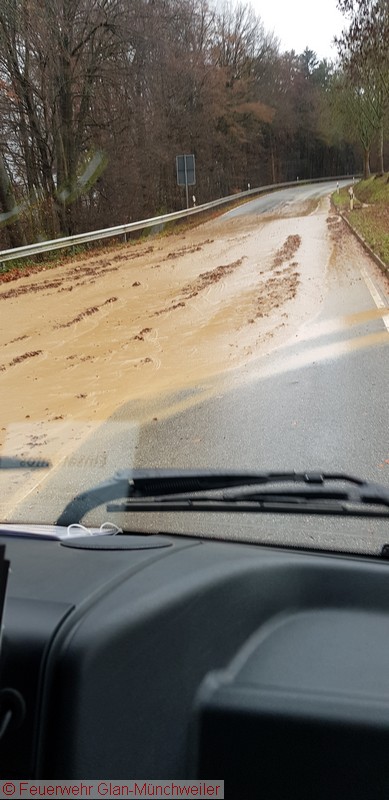Aufgrund des Starkregens lief Wasser und Schlamm von einem angrenzenden Feld auf die L350. Die Einsatzstelle wurde abgesichert und ein Gully freigeräumt, so dass das Wasser größtenteils abfließen konnte. Anschließend wurde die Einsatzstelle der hinzugezogenen Straßenmeisterei übergeben.