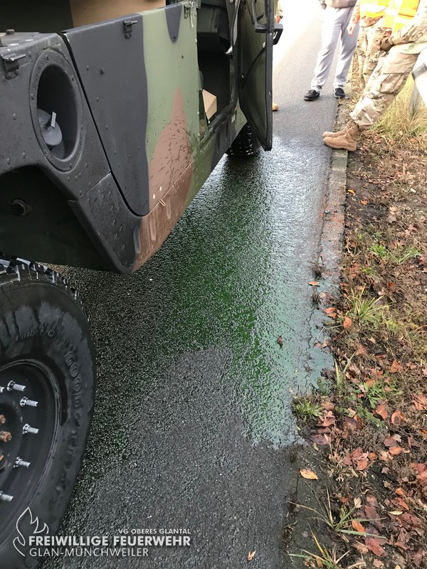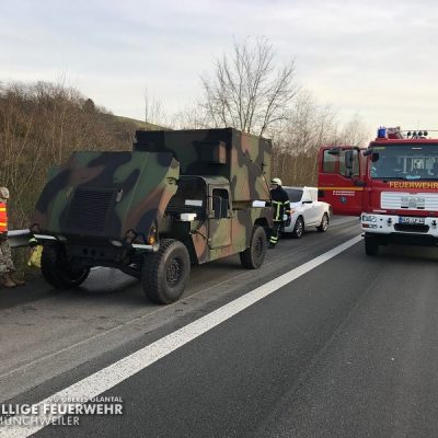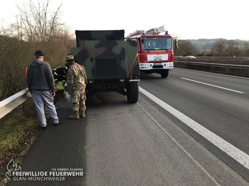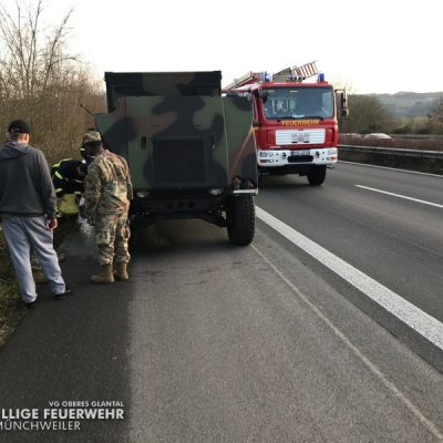 Um 15:38 Uhr wurde die Feuerwehr Glan-Münchweiler am Mittwochnachmittag zu einem Fahrzeugbrand auf die BAB 62 in Fahrtrichtung Kusel, kurz vor den Parkplatz „Am Potzberg“, alarmiert. Durch einen Defekt an einem Militärfahrzeug war Kühlerflüssigkeit ausgetreten und hatte eine Verqualmung verursacht. Eine Brandbekämpfung war nicht erforderlich, jedoch wurden die ausgelaufenen Betriebsstoffe abgestreut. Anschließend konnte die Einsatzstelle der Polizei übergeben werden.