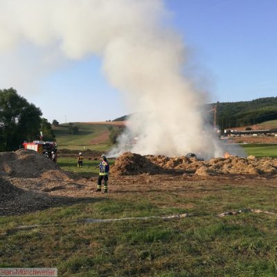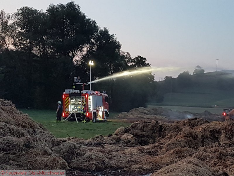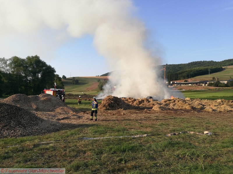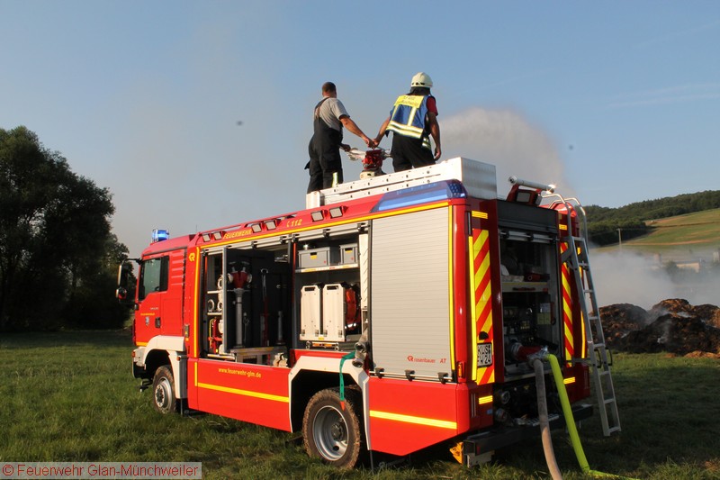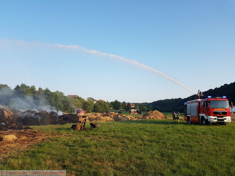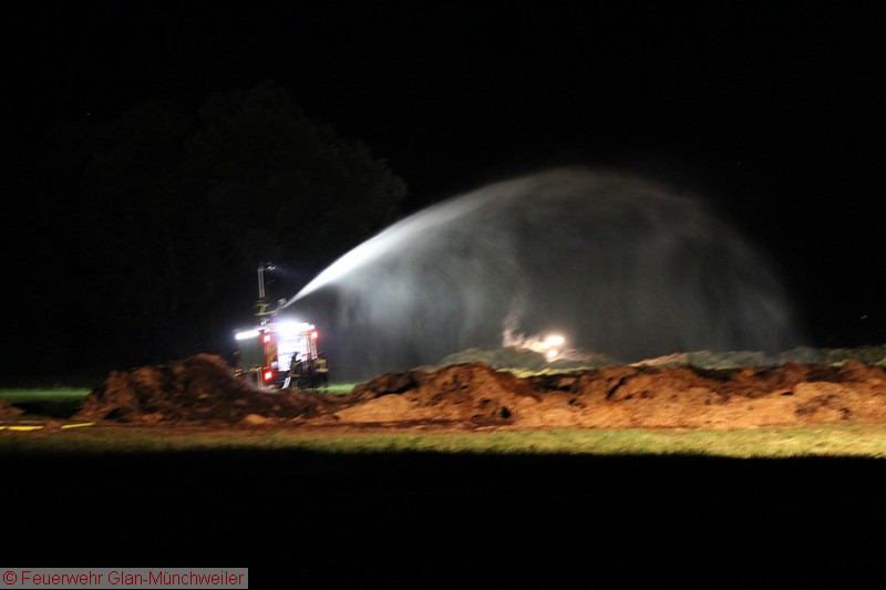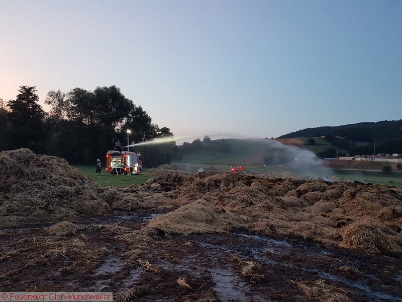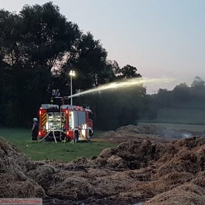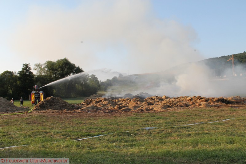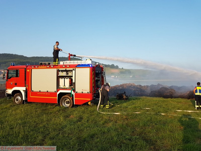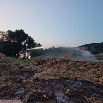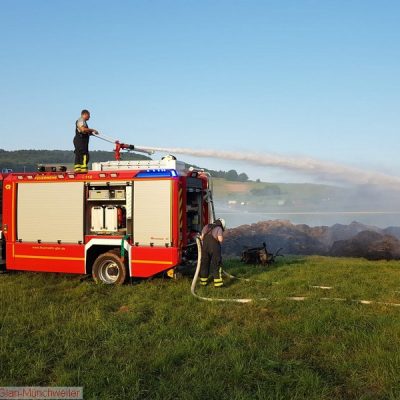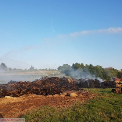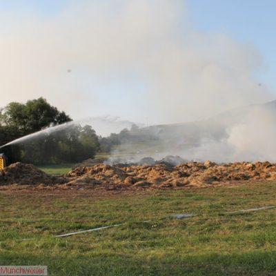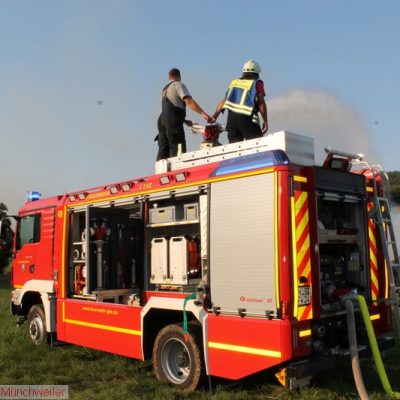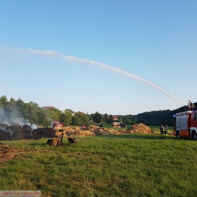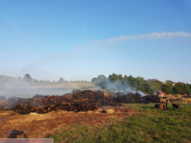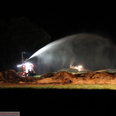 „Flächenbrand groß“ lautete die Alarmdurchsage der Integrierten Leitstelle Kaiserslautern für die Einheiten Matzenbach, Rehweiler, Quirnbach und Glan-Münchweiler. Erneut ging es in die Glanwiesen nach Matzenbach. Das auseinandergezogene Heu und Stroh vom Lagerhallenbrand stand, trotz mehrfacher vorhergehender Kontrolle, auf einer Fläche von ca. 400 m² in Brand. Das Feuer wurde mit zwei Wasserwerfern abgelöscht und mit zwei Teleskopladern weiter auseinandergezogen.