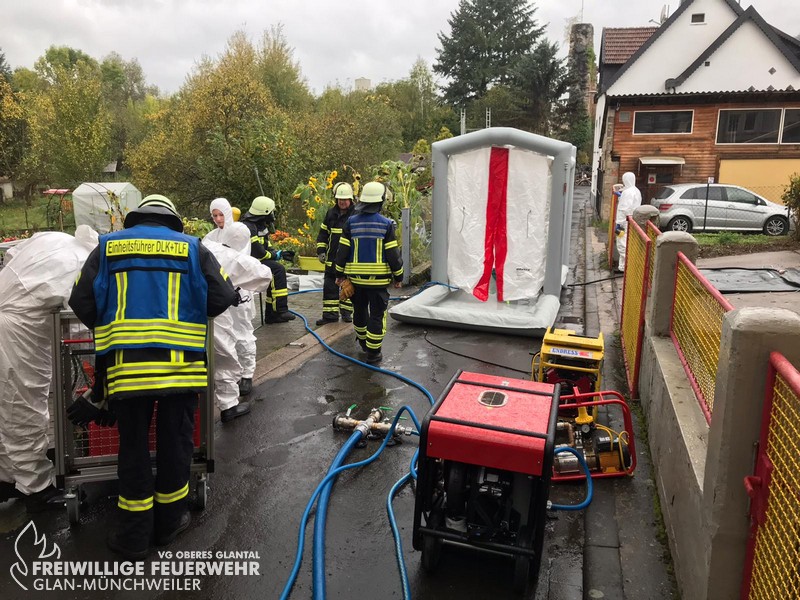 Nachdem die Auswertungen der am Abend zuvor durchgeführten Messproben beim Einsatz in Odenbach durch die BF Ludwigshafen übermittelt wurden, musste am Donnerstagmittag erneut die Messgruppe des Gefahrstoffzuges zur Einsatzstelle ausrücken, da Rückstände von Gefahrstoffen bestätigt werden konnten. Parallel dazu wurde der Einsatzleitwagen 2 angefordert, da sich die am Tag zuvor und in der Nacht ca. 80-100 eingesetzten Kräfte womöglich einer Untersuchung (Biomonitoring) unterziehen müssten. Aufgrund der Dringlichkeit zur Entnahme von weiteren Luftproben zur Beurteilung der Lage wurde vor Ort entschieden, die nächstgelegene Dekontaminationseinheit (LK Bad Kreuznach) zu alarmieren. Anschließend wurden an der Einsatzstelle sowie an den in der Nacht geborgenen und mittlerweile an die Kläranlage verbrachten Behältern durch das Mef-G LK Kusel sowie GW-Mess LK Bad Kreuznach Luftproben für eine erneute Überbringung zur BF Ludwigshafen entnommen. Für das im Anschluss folgende Biomonitoring der beteiligten Einsatzkräfte wurde die Führungsstaffel Altenglan (als Ersatz für den in der Werkstatt befindlichen FüKW des Landkreises) sowie die SEG in die Feuerwache Lauterecken alarmiert und bereiteten die Datenaufnahme und Urinproben vor. Ein hinzugezogener Arzt aus Landau verbrachte alle Proben zur Untersuchung zur BASF Ludwigshafen und konnte am frühen Freitagmorgen Entwarnung für alle Kräfte geben.