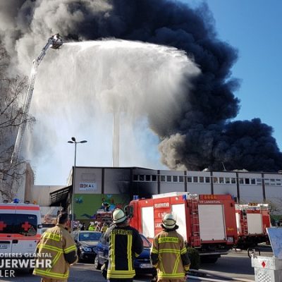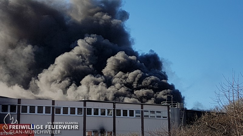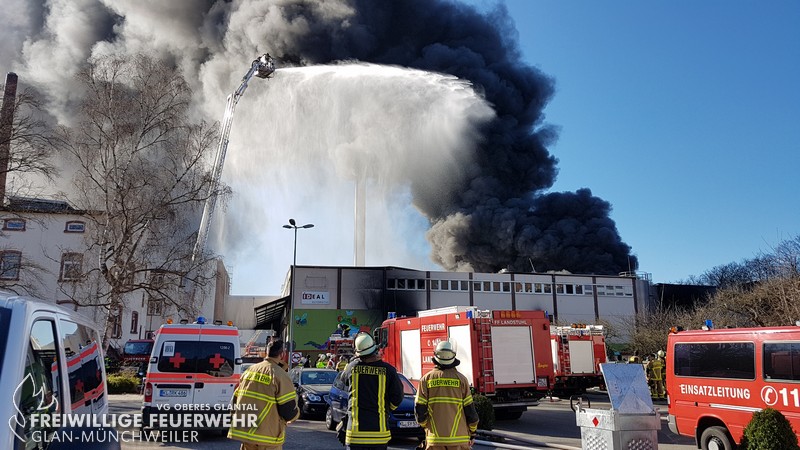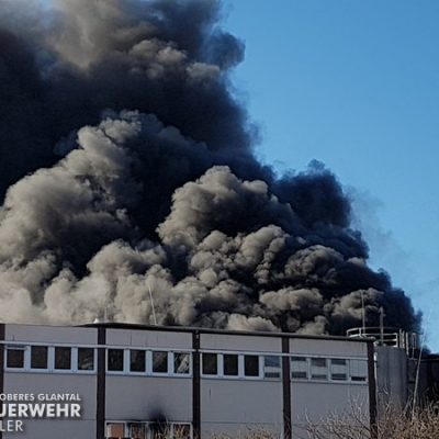 Mit Stand 20 Uhr waren ca. 30 bis 40 Prozent der Firma niedergebrannt. Die Löscharbeiten werden die ganze Nacht und voraussichtlich auch am Montag weiter fortdauern.