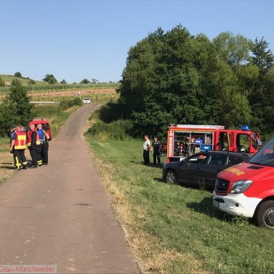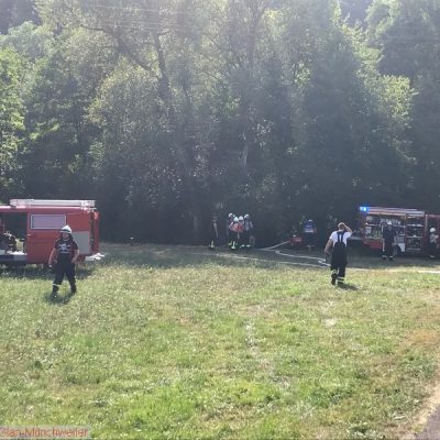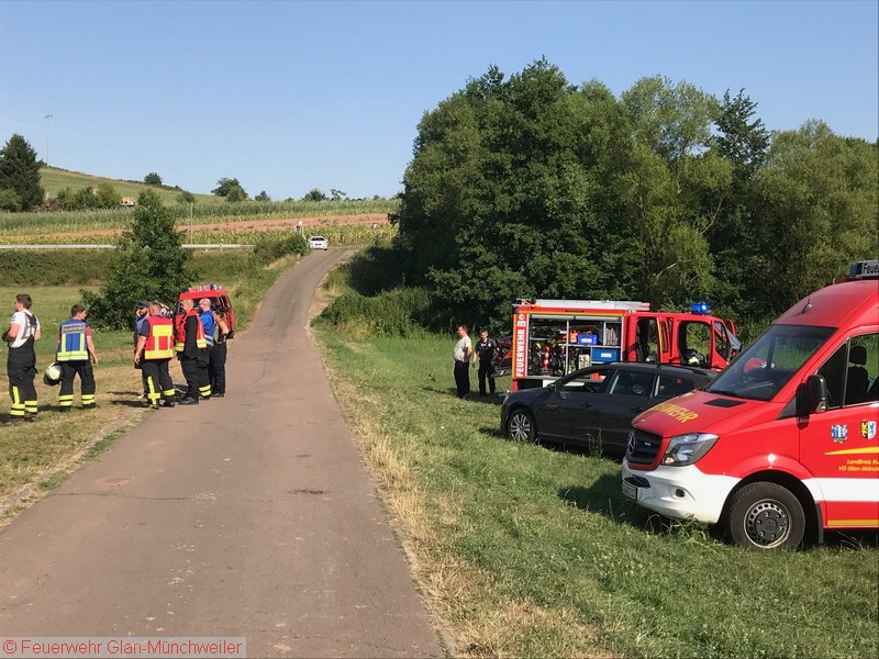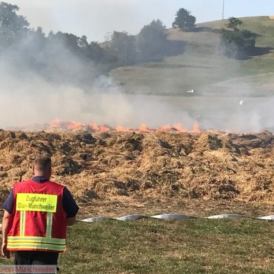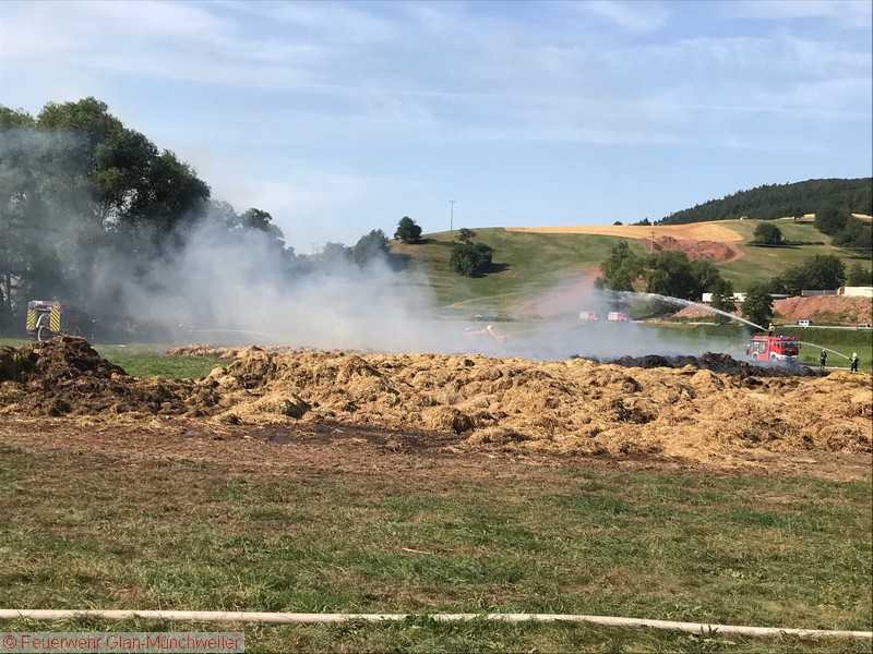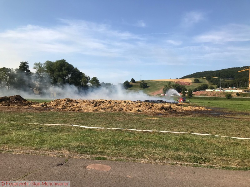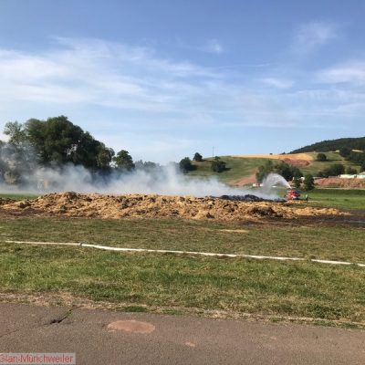 „Flächenbrand klein“ lautete die Alarmdurchsage der Integrierten Leitstelle Kaiserslautern für die Einheiten Matzenbach, Rehweiler, Quirnbach und Glan-Münchweiler. Zum fünften mal ging es in die Glanwiesen nach Matzenbach. Das auseinandergezogene Heu und Stroh stand erneut in Brand. Bedingt durch die hohe Außentemperatur trocknet das Heu und Stroh an der Oberfläche sehr schnell ab, während es sich im Innern durch den anhaltenden Gärprozess weiter erhitzt. Dies führt immer wieder dazu, dass es sich selbst entzündet. Auf Grund der enormen Rauchentwicklung im Ortsbereich von Godelhausen wurde durch die ILS Kaiserslautern ebenfalls Alarm für die Feuerwehreinheiten aus Theisbergstegen, Haschbach, Etschberg und Kusel ausgelöst.