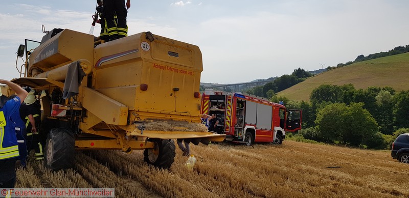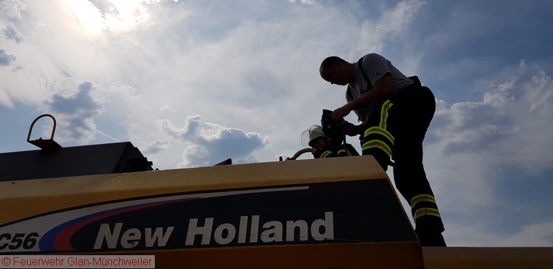 Noch während der Nachbearbeitung des Flächenbrandes in Breitenbach wurden wir telefonisch über einen Mähdrescherbrand in Glan-Münchweiler auf der Gemarkung „Galgenberg“ informiert. Umgehend erfolgte ein Nachalarm für die Feuerwehr Glan-Münchweiler.