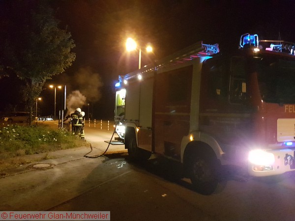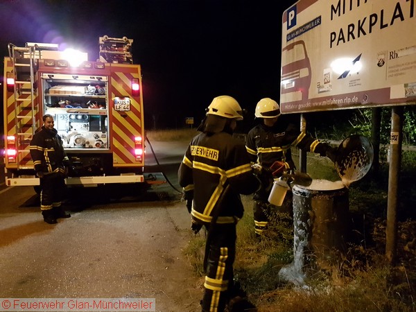 Die ILS Kaiserslautern alarmierte die die Feuerwehr Glan-Münchweiler zu einem brennenden Mülleimer auf dem Mitfahrerparkplatz in Glan-Münchweiler. Der Brand wurde mit dem Schaumschnellangriff des HLF abgelöscht. Der Einsatz für die Feuerwehr war somit beendet.