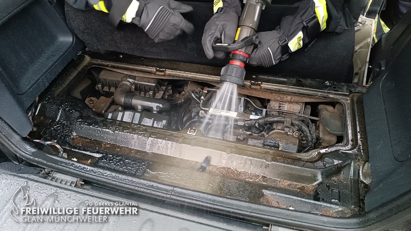 Am Freitagabend wurden die Feuerwehren Rehweiler und Glan-Münchweiler von der Integrierten Leitstelle Kaiserslautern zu einem PKW-Brand nach Rehweiler alarmiert. Auf der B 423 bei Rehweiler in Fahrtrichtung Matzenbach wurde ein Fahrzeug mit leichter Rauchentwicklung im Motorraum und starkem Brandgeruch vorgefunden. Die Feuerwehr sicherte die Einsatzstelle gegen den fließenden Verkehr ab, kontrollierte den betroffenen Bereich mit der Wärmebildkamera und kühlte die heißen Stellen mittels Schnellangriffsleitung ab.