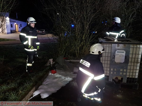 Da die Entwässerung des Parkplatzes direkt an einen Bach angeschlossen war, war es erforderlich direkt zu Einsatzbeginn für eine Löschwasserrückhaltung zu sorgen. Der Kanaleinlauf wurde mit einem Kanaldichtsack verschlossen und das Wasser-Schaumgemisch mit einer Tauchpumpe und einem Wassersauger in IBC-Behälter aufgenommen.