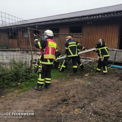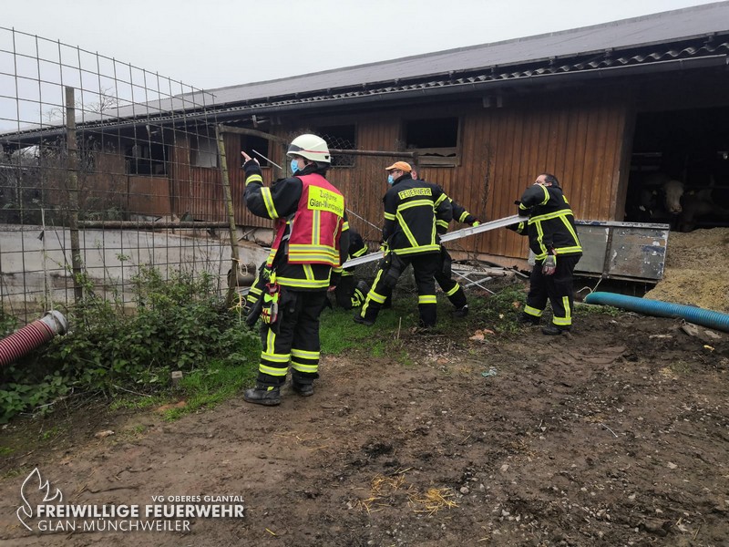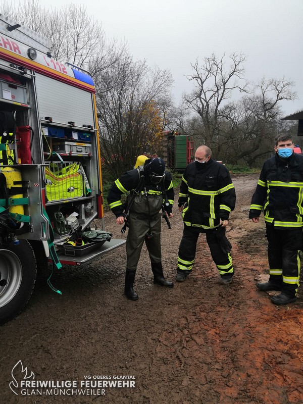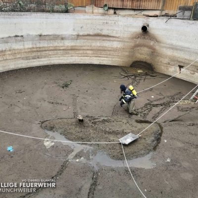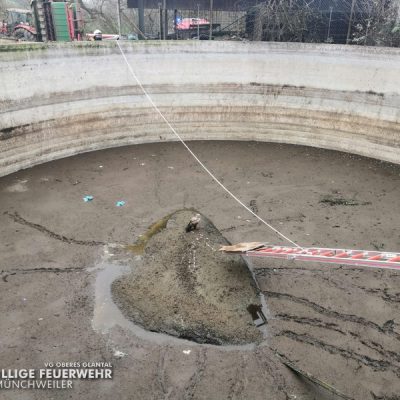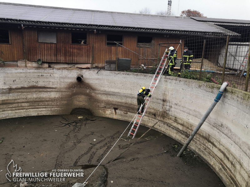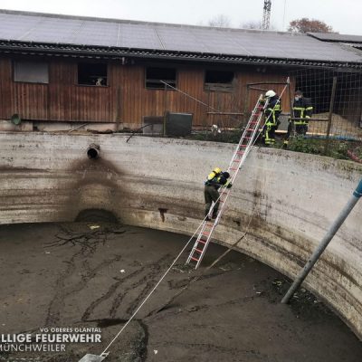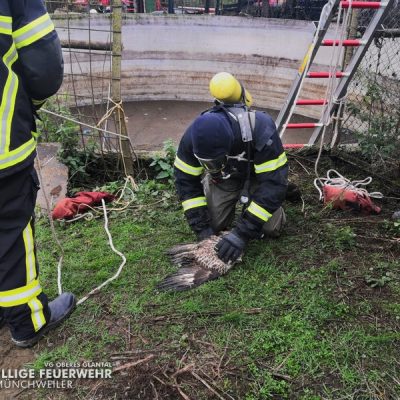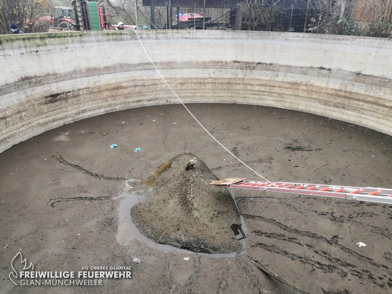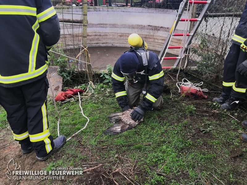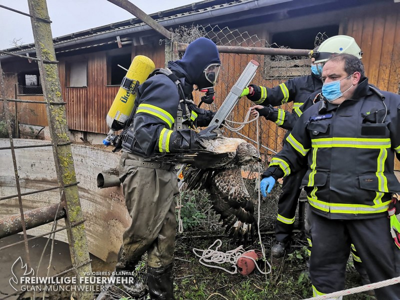 Die Integrierte Leitstelle Kaiserslautern alarmierte zur Mittagszeit die Ausrückgemeinschaft Quirnbach / Rehweiler / Matzenbach sowie das IUK-Personal der Feuerwehr Glan-Münchweiler zu einer Tierrettung nach Matzenbach. Ein Greifvogel war in die Güllegrube einer Biogasanlage gestürzt und konnte sich glücklicherweise auf eine Ansammlung von Ästen retten. Dem geschwächten Tier gelang es jedoch nicht, sich aus eigener Kraft, aus seiner misslichen Lage zu befreien. Da die ersten Rettungsversuche mit einem Leiterhebel scheiterten, rüstete sich ein Feuerwehrmann mit Wathosen und Atemschutzgerät aus um das Tier aus der Grube zu retten.