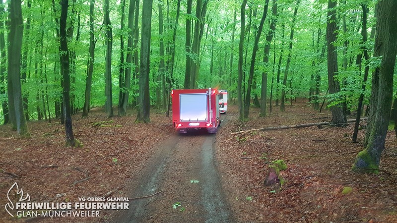 Die ILS Kaiserslautern alarmierte die Ausrückgemeinschaft Henschtal / Steinbach sowie die kleine Gruppe der Feuerwehr Glan-Münchweiler zu einer Tragehilfe im Wald. Nach einem medizinischen Notfall forderte der Rettungsdienst die Feuerwehr zur Unterstützung beim Retten der Person an.
