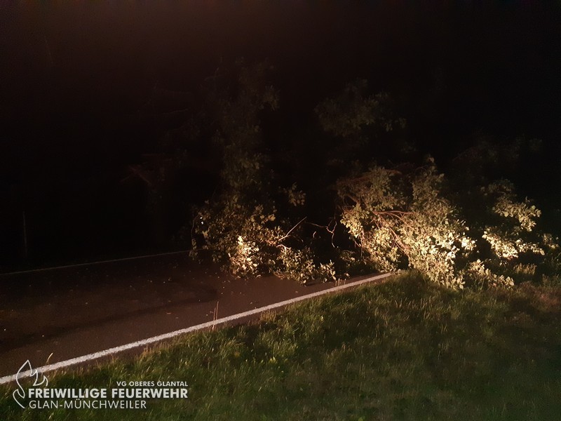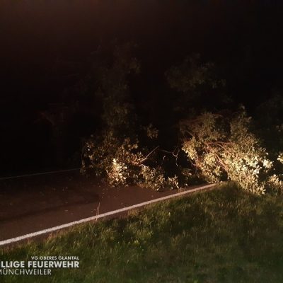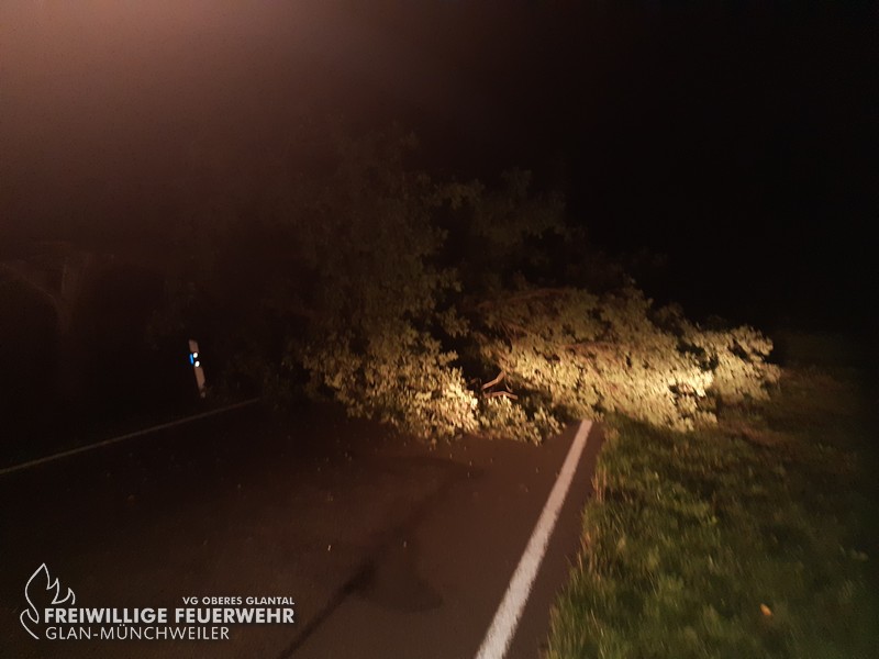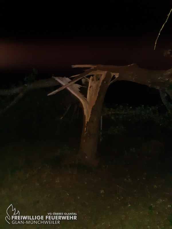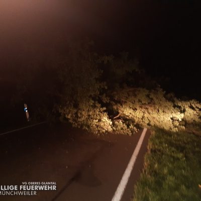 Heute morgen um 04:00 wurden die Ausrückgemeinschaft Nanzdietschweiler/Börsborn sowie die IUK-Gruppe der Feuerwehr Glan-Münchweiler zu einem umgestürzten Baum auf die K 59 alarmiert. Beim Eintreffen an der E-Stelle konnte ein umgestürzter Baum mit ca. 50 cm Durchmesser ausfindig gemacht werden. Aufgrund der ungünstigen Lage, der Baum war gespalten und stand unter Spannung, wurde eine Vollsperrung eingerichtet und die Einsatzstelle an den Landesbetrieb Mobilität übergeben.