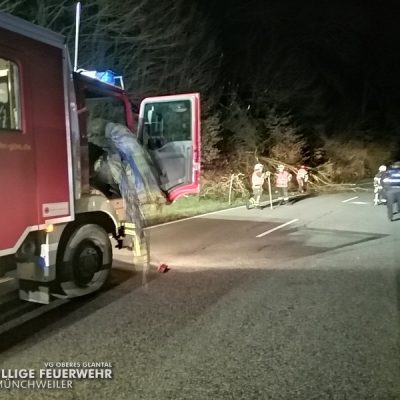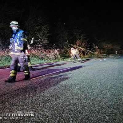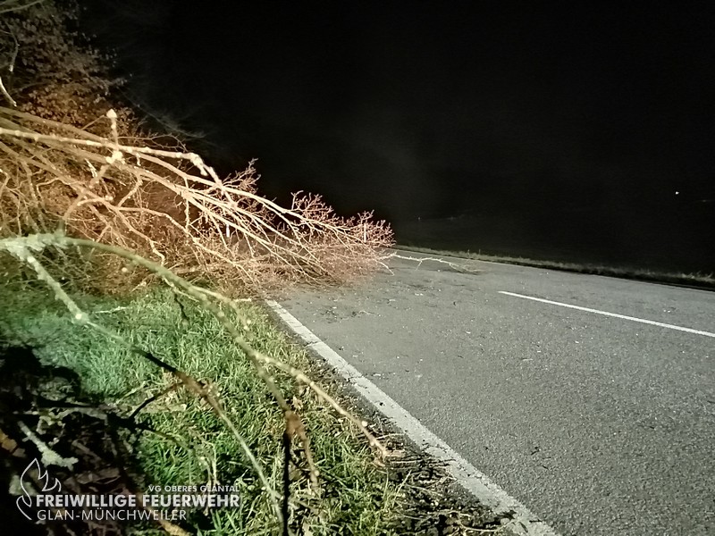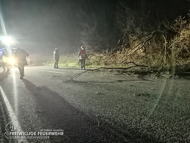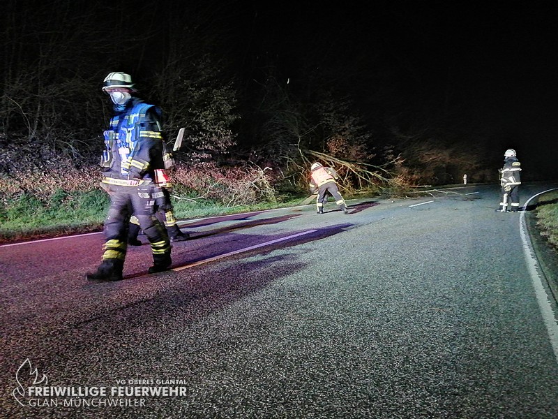 In der Nacht auf Freitag wurde die kleine Gruppe der Feuerwehr Glan-Münchweiler zu einem umgestürzten Baum auf die L363 zwischen Glan-Münchweiler und Niedermohr alarmiert. Die Gefahrenstelle wurde beseitigt und die Fahrbahn gereinigt. Der Einsatz war anschließend beendet.