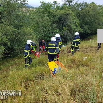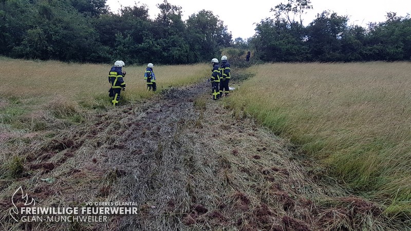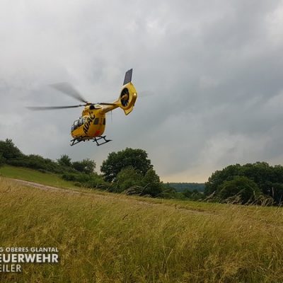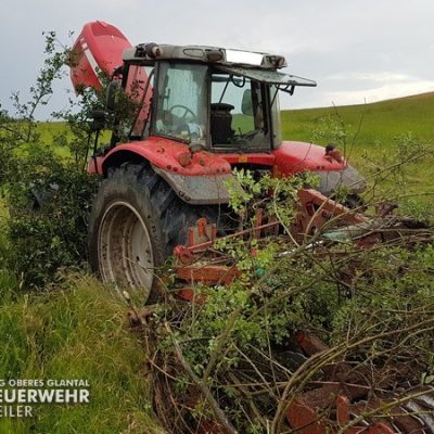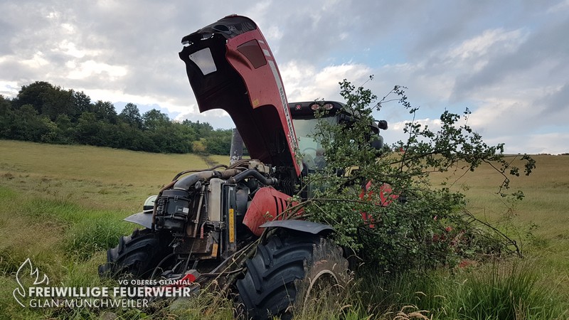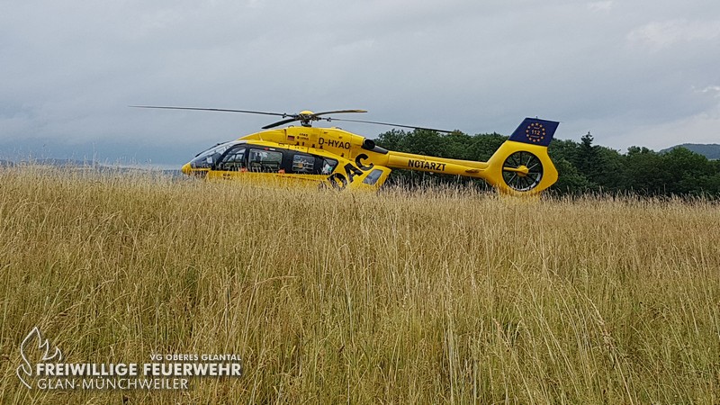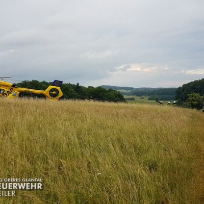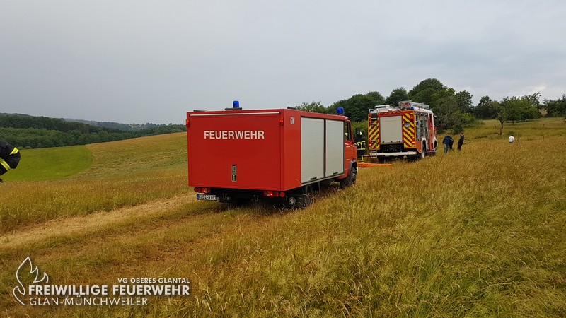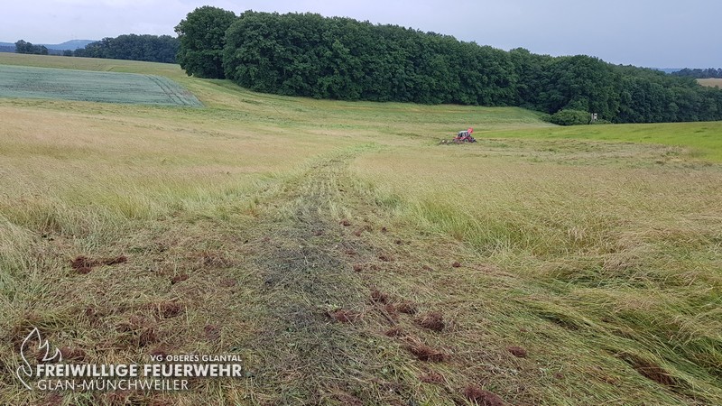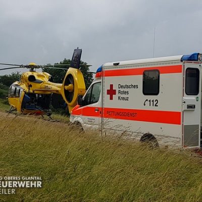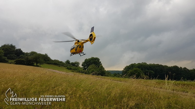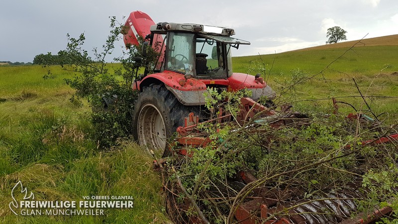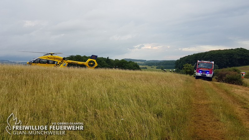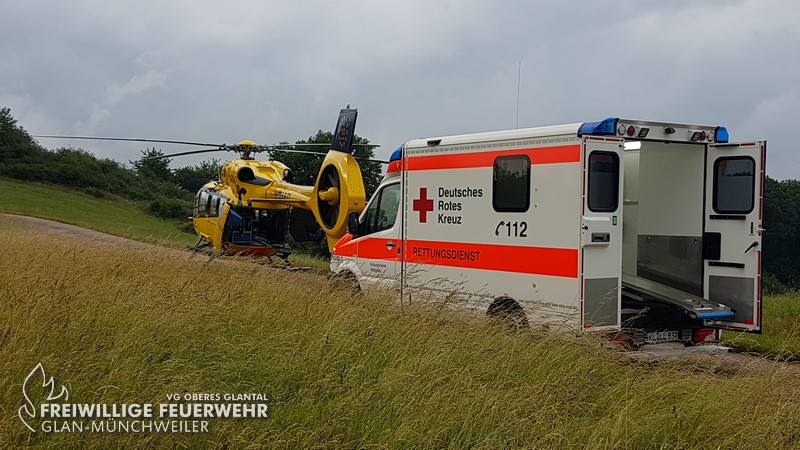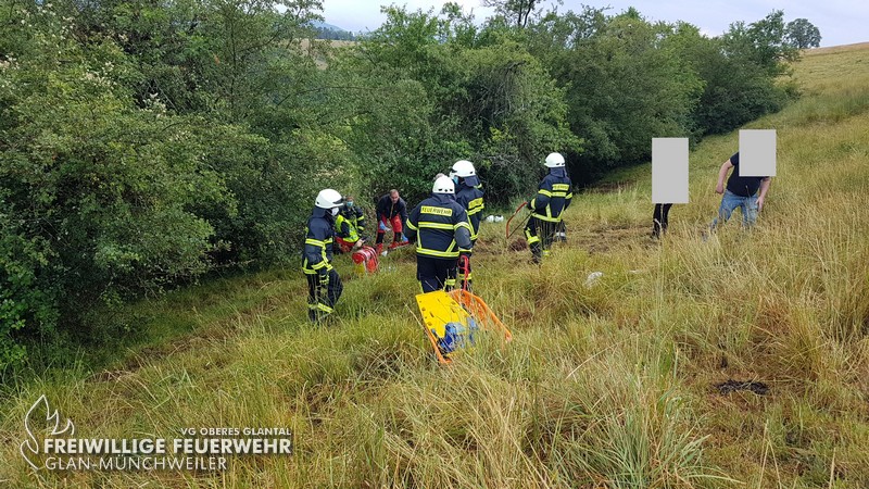 Am Freitagabend wurde die Feuerwehreinheit Glan-Münchweiler sowie die Ausrückgemeinschaft Nanzdietschweiler/Börsborn gemeinsam mit dem Rettungsdienst aus Landstuhl und dem Rettungshubschrauber Christoph 66 zu einem Einsatz in Nanzdietschweiler alarmiert. Die Meldung lautete „Person unter landwirtschaftlichem Gerät eingeklemmt“. An der Einsatzstelle stellte sich die Situation jedoch völlig anders dar: Ein Traktor stand abseits des Weges in einer Wiese, circa 120 m oberhalb des Fahrzeuges lag der Fahrer schwerverletzt in einem Gehölz, welches der Traktor unbemannt durchfahren hatte. Nur durch Zufall wurde die Person von Passanten aufgefunden, die sich über den herrenlosen Taktor mitten in der Wiese gewundert hatten.