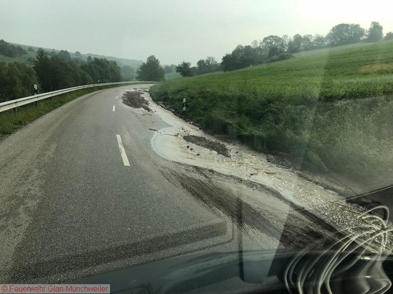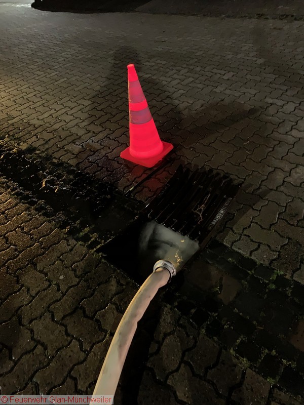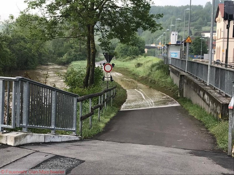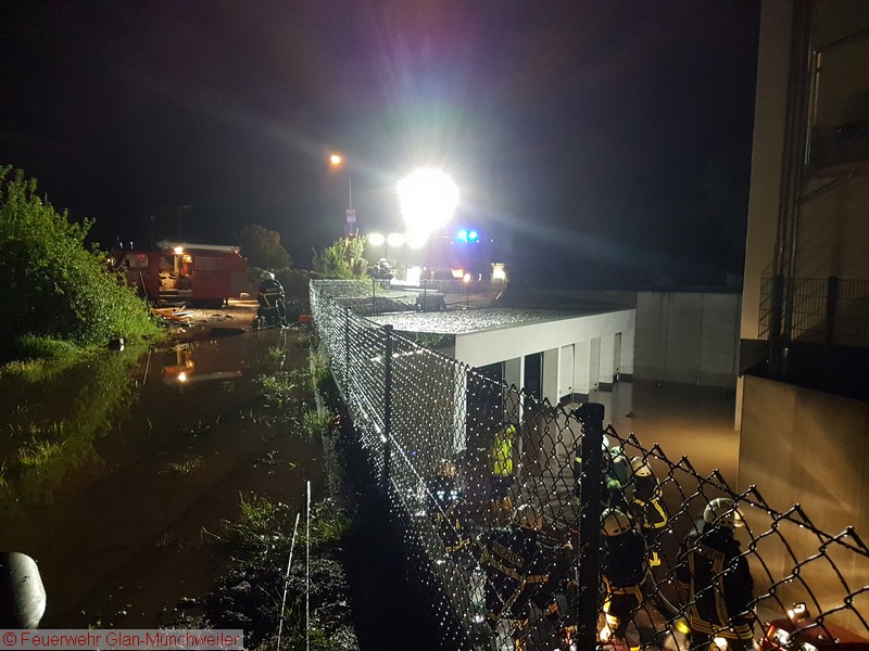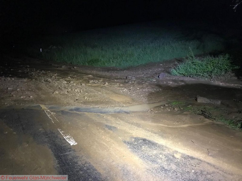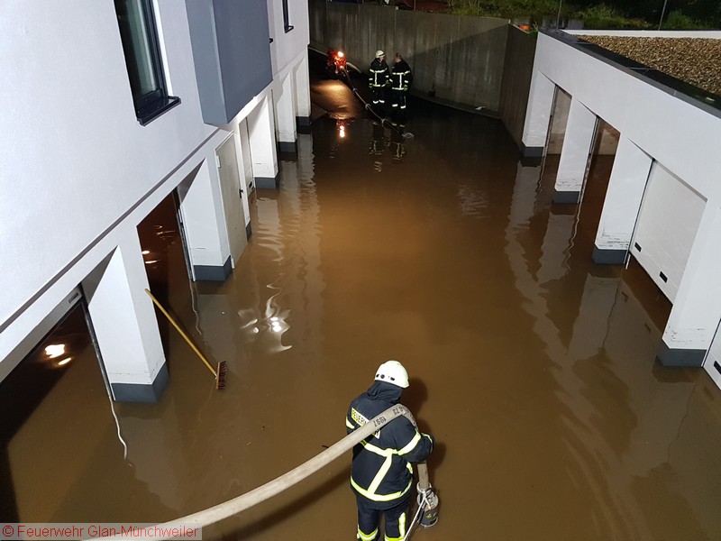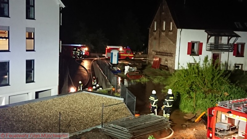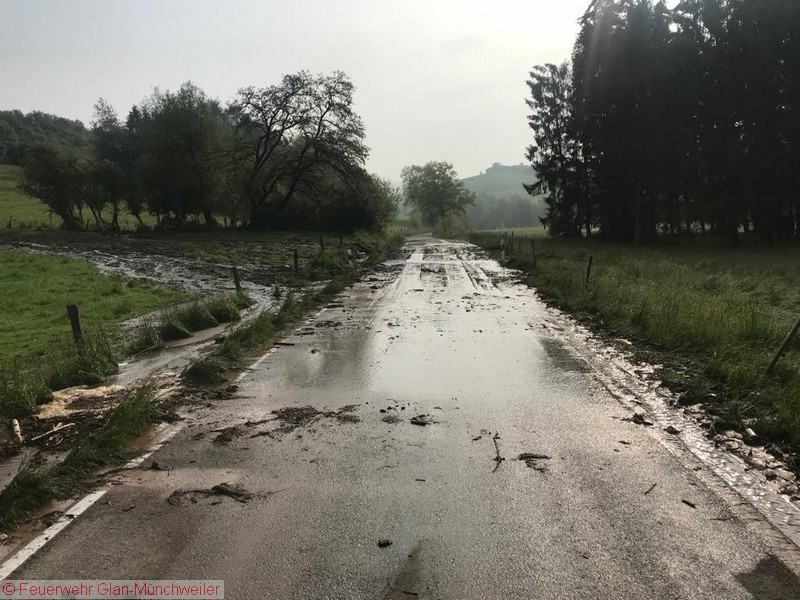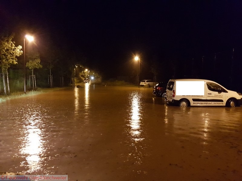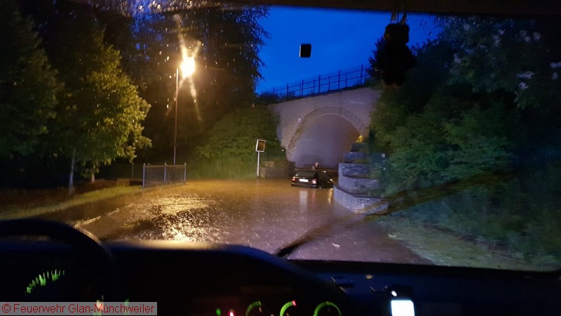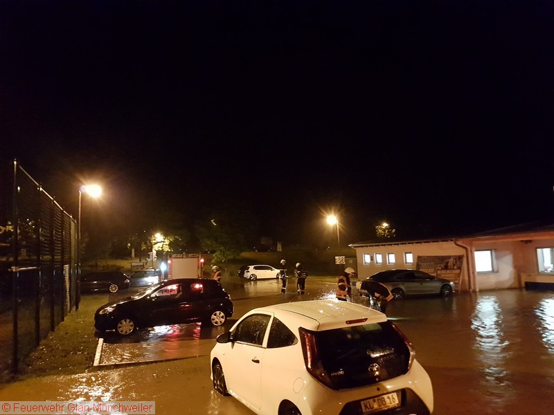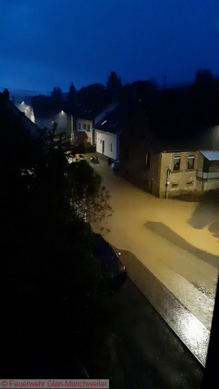 Eine Unwetterzelle mit Starkregen und Gewitter, wie es noch niemand von uns erlebt hatte, lag am Sonntagabend über dem nördlichen Bereich der Verbandsgemeinde Oberes Glantal. Innerhalb weniger Minuten fiel so viel Niederschlag, dass es nicht mehr möglich war, die Wassermassen über die Kanalisation abzuführen. Bereits auf der Anfahrt zum gemeldeten Wohnungsbrand in Nanzdietschweiler (Einsatz 032), welche im Schritttempo erfolgte, stand die Bahnhofstraße in Glan-Münchweiler ca. 20 cm unter Wasser und die Kanaldecken schwammen auf dem Wasser.