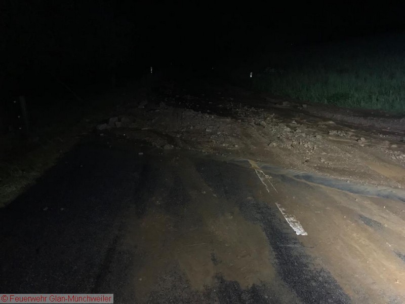Zahlreiche Einsatzstellen mussten bis zum nächsten Morgen abgearbeitet werden. Vollgelaufenen Keller, von Geröll überschwemmte Straßen sowie unterspülte und eingebrochene Straßenabschnitte absichern bildeten den Großteil der Einsatzmeldungen.