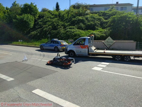Der Kommandowagen (GLM 10-1) rückte, besetzt mit einem First Responder, zum Verkehrsunfall aus um die Erstversorgung des Kradfahrers sicherzustellen. Zur Absicherung der Einsatzstelle fuhr der Gerätewagen Technik ebenfalls die Einsatzstelle an. Da es sich lediglich um einen leichten Zusammenstoß zwischen Krad und PKW handelte, blieb die Moltorradfahrerin glücklicherweise unverletzt. Die Maßnahmen der Feuerwehr beschränkten sich somit lediglich auf die Absicherung der Einsatzstelle.