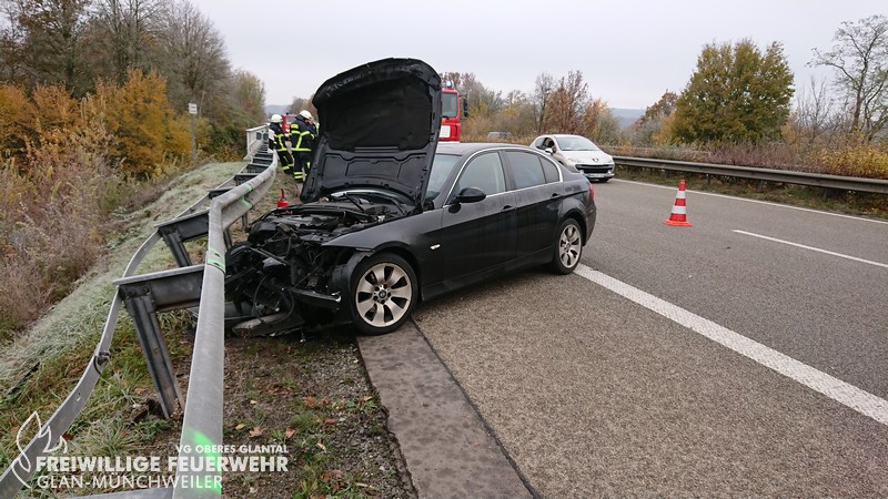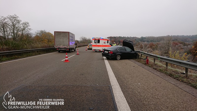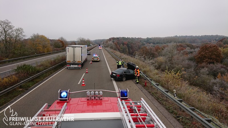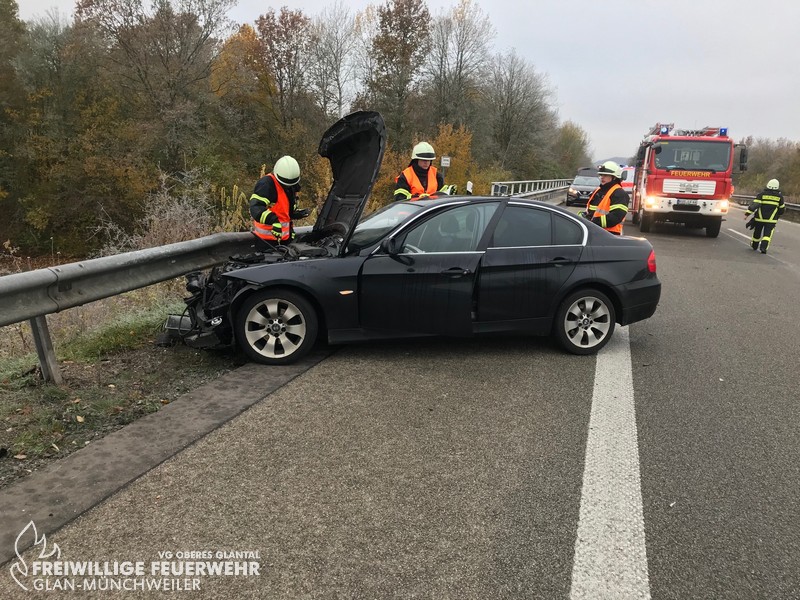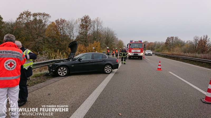 Am Mittwochmorgen wurde die Feuerwehr Glan-Münchweiler zu einem Verkehrsunfall auf BAB 62 in Fahrtrichtung Hütschenhausen alarmiert. Bei Eintreffen an der Einsatzstelle war bereits ein Krankentransportwagen vor Ort und betreute den Fahrer des verunfallten PKWs. Der BMW war nach Kollission mit der Mittel- und Seitenleitplanke auf dem Seitenstreifen zum Stehen gekommen. Die Einsatzstelle wurde abgesichert, der Brandschutz sichergestellt und auslaufende Betriebsmittel aufgefangen. Ein Rettungswagen verbrachte den Patienten ins Krankenhaus, so dass nach Übernahme der Verkehrsabsicherung durch den LBM die Einsatzstelle an die Autobahnpolizei übergeben werden konnte.