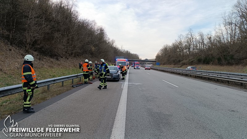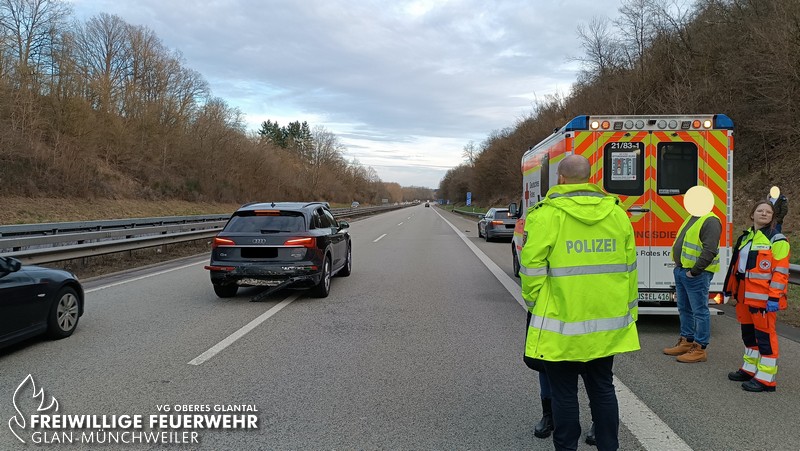 Am Freitagnachmittag alarmierte uns die ILS Kaiserslautern zu einem Verkehrsunfall mit unklarer Lage auf die BAB 62 in Fahrtrichtung Kusel. Bereits auf der Anfahrt konnten wir feststellen, dass sich die Einsatzstelle jedoch auf der Gegenfahrbahn kurz vor der Abfahrt Glan-Münchweiler befand. In Absprache mit der Leitstelle wurde die Autobahn bis Kusel kontrolliert und die Einsatzstelle angefahren. Der Wehrleiter der VG Kusel-Altenglan wurde telefonisch informiert. Vor Ort kam es zu einem Auffahrunfall mit zwei beteiligten Fahrzeugen. Ein Fahrzeug stand auf dem Standstreifen, das zweite Fahrzeug stand mitten auf der Autobahn. Die Fahrzeuginsassen wurden bereits außerhalb der Fahrzeuge durch die Besatzung eines Rettungswagens betreut. Die Einsatzstelle wurde abgesichert, das Unfallfahrzeug auf den Standstreifen geschoben und auf auslaufende Betriebsstoffe kontrolliert.