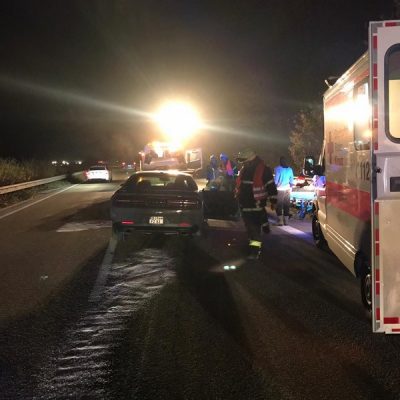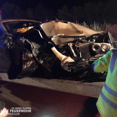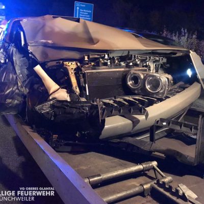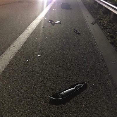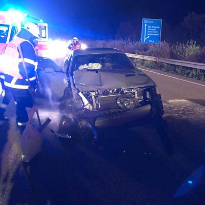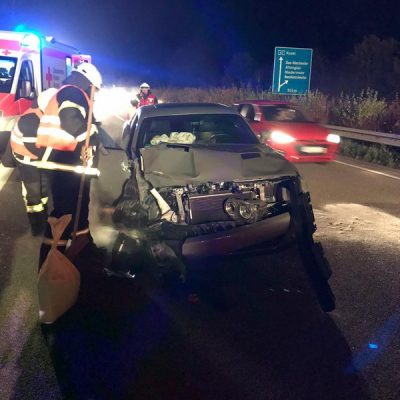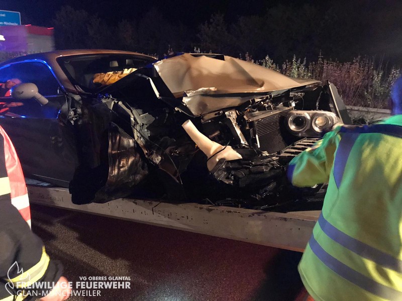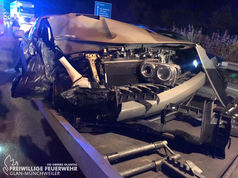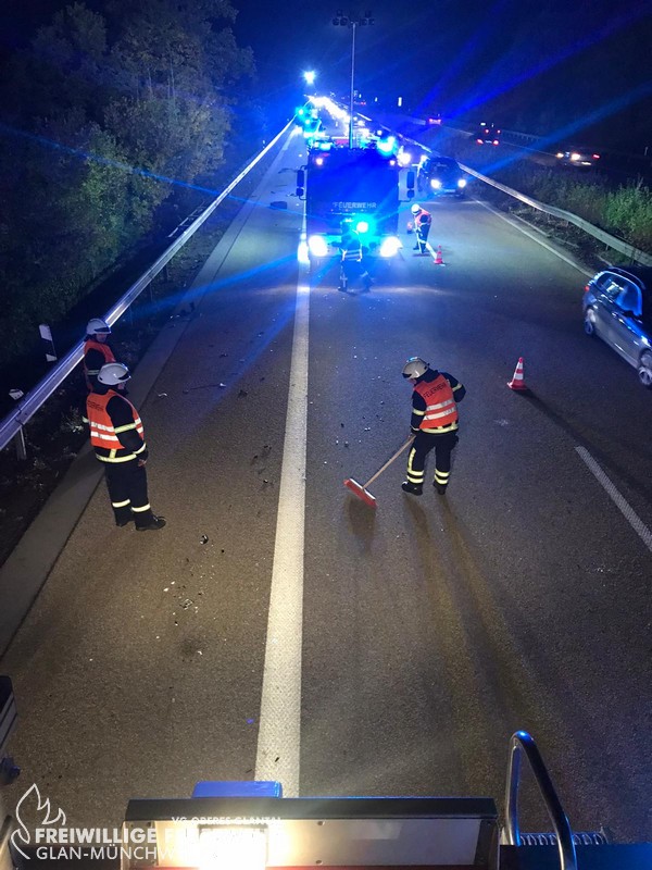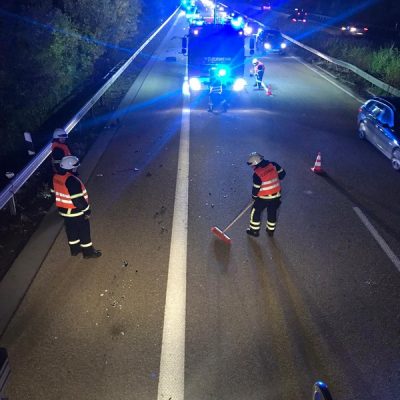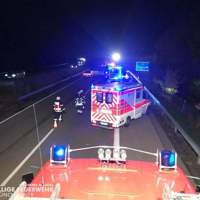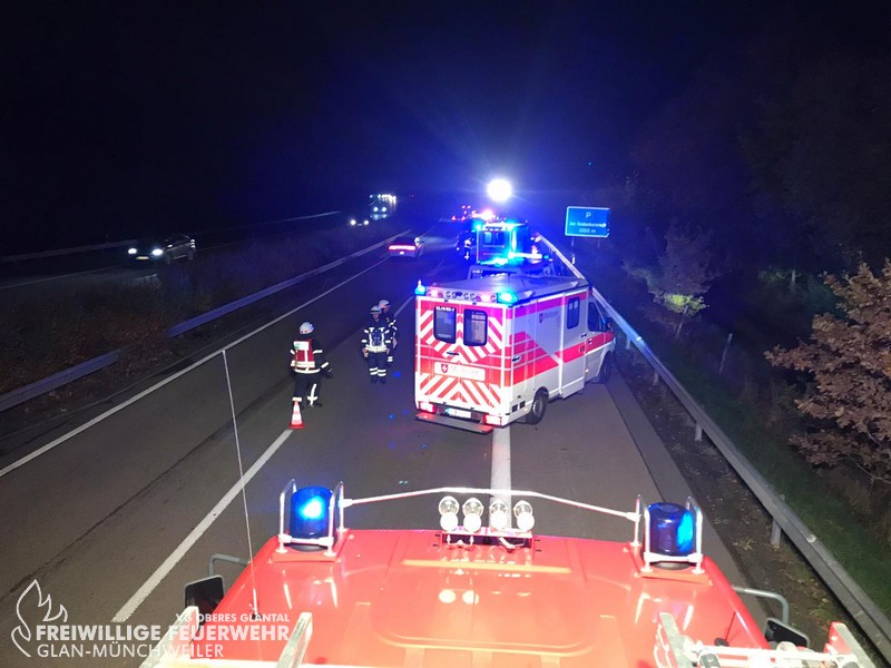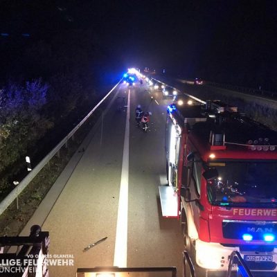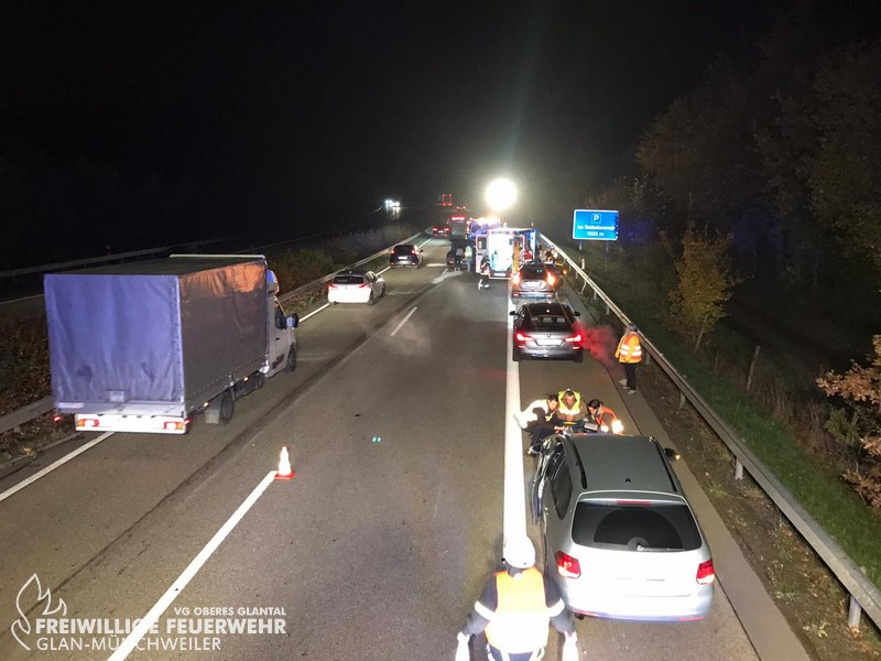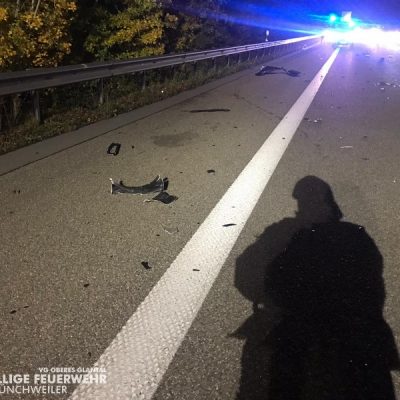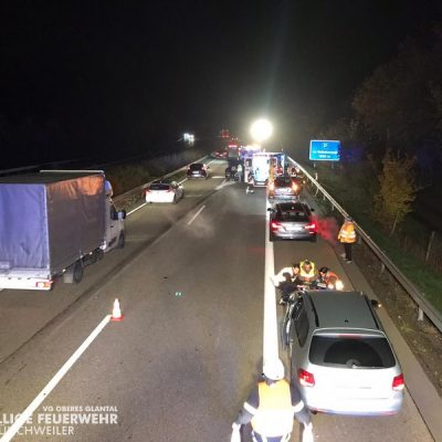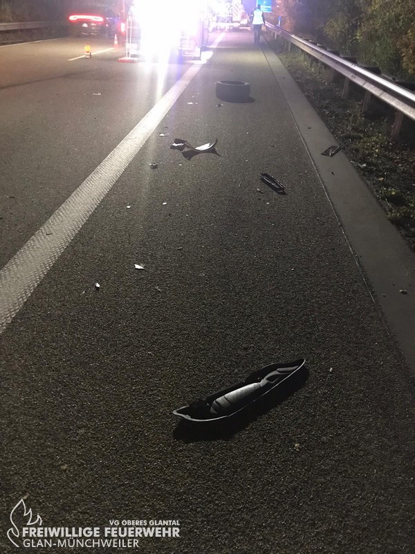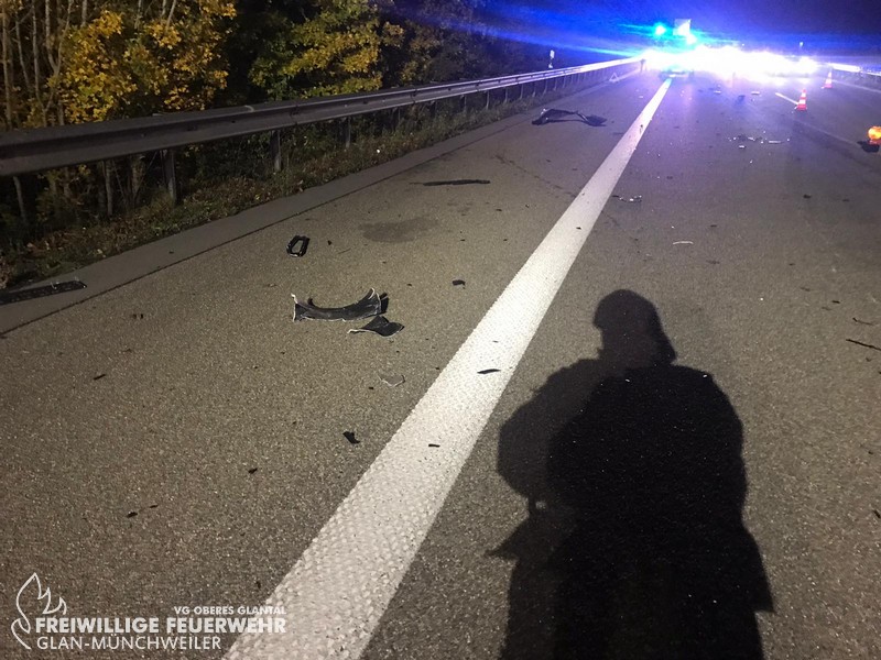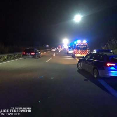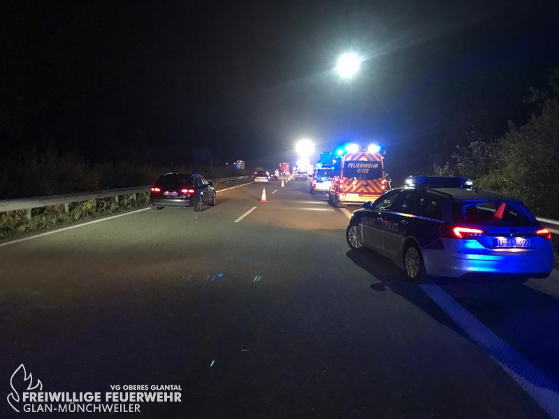 Am Freitagabend alarmierte die ILS Kaiserslautern die Feuerwehr Glan-Münchweiler zu einem Verkehrsunfall auf die BAB 62, Glan-Münchweiler in Fahrtrichtung Hütschenhausen. Ein amerikanischer Verkehrsteilnehmer fuhr mit hoher Geschwindigkeit in das Heck eines Sattelaufliegers, schleuderte anschließend ca. 200 m über die Autobahn und kam auf dem rechten Fahrstreifen zum stehen. Zwei weitere Fahrzeuge, welche sich hinter dem Unfallverursacher befanden, führen in die Trümmerteile, was ebenfalls zu erheblichen Beschädigungen an ihren Fahrzeugen führte. An zwei der vier beteiligten Fahrzeuge liefen Betriebsstoffe aus, welche mittels Bindemittel abgestreut wurden. Drei verletzte Personen, wovon sich zwei Personen auf dem Standstreifen befanden und eine noch in ihrem Fahrzeug, wurden bis zum Eintreffen der Rettungsmittel (3 x Rettungswagen, 1 x Krankenwagen, 1 x Notarzteinsatzfahrzeug) durch die Feuerwehr versorgt. Die Einsatzstelle wurde abgesichert, ausgeleuchtet und gemeinsam mit dem Landesbetrieb Mobilität (LBM) gereinigt. Auf Grund der enormen Verschmutzung wurde vom LBM ein Kehrfahrzeug zur Endreinigung eingesetzt.