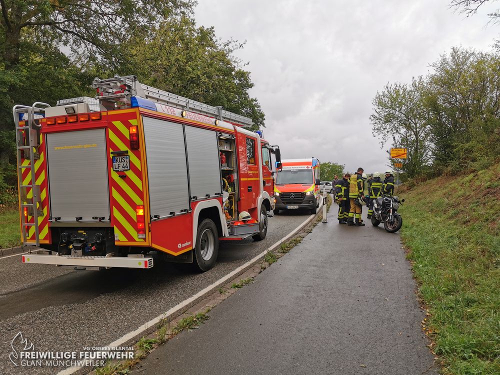 Mit der Meldung „PKW vs. Motorrad“ wurden am Donnerstagmorgen die Feuerwehren Glan-Münchweiler und Quirnbach auf die B423 an den Ortseingang von Glan-Münchweiler alarmiert. Vor Ort stellte sich heraus, dass eine Motorradfahrerin im Kurvenbereich alleinbeteiligt verunfallt war und auf dem Gehweg durch Ersthelfer und First Responder betreut wurde.
