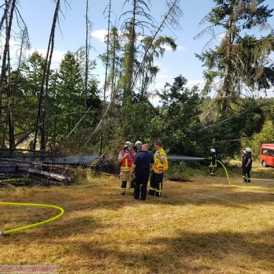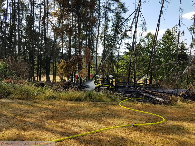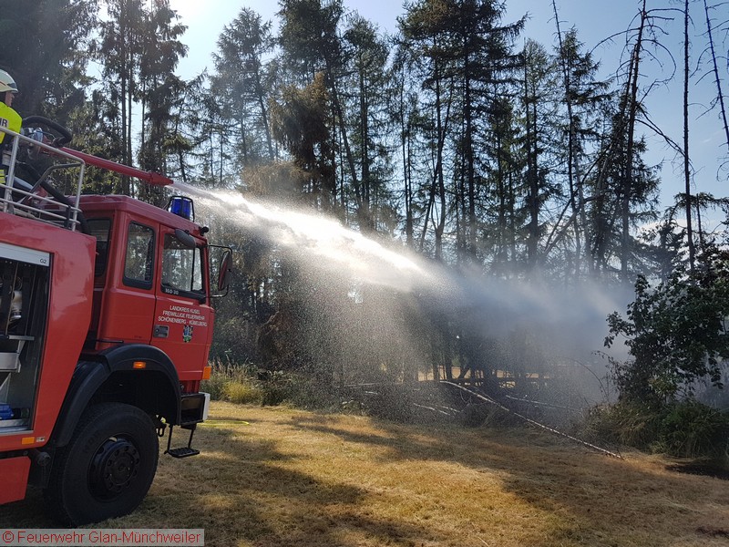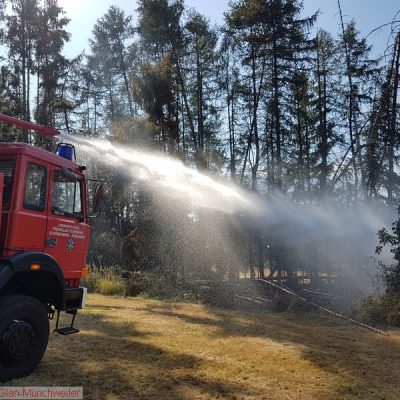 Auf einer Fläche von ca. 500 qm brannte es in einem Nadelwald. Zur Sicherstellung der Wasserversorgung wurden das TLF 24/50 und das TLF 16/25 der Feuerwehr Schönenberg-Kübelberg sowie das TLF 4000 der Feuerwehr Glan-Münchweiler nachgefordert.