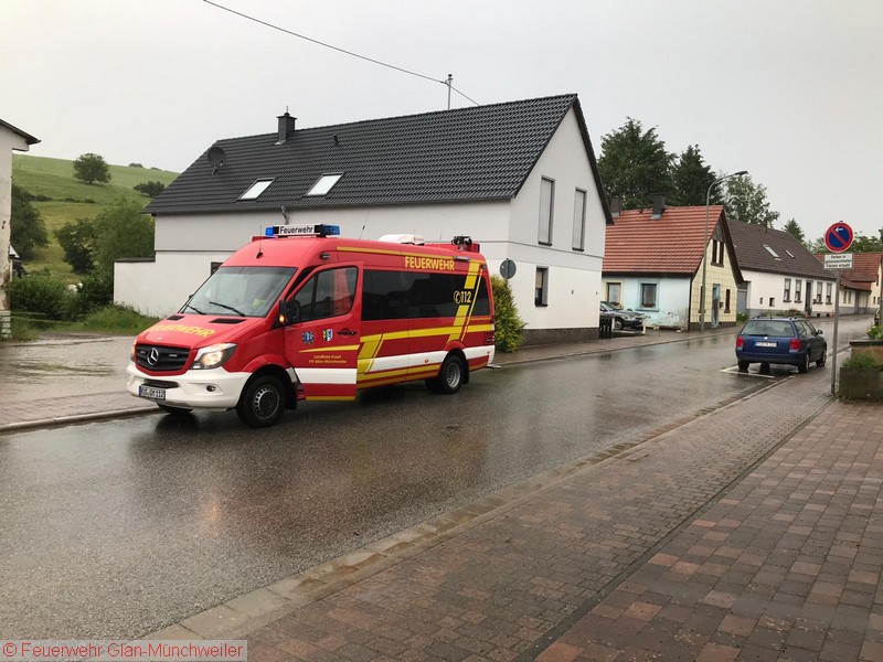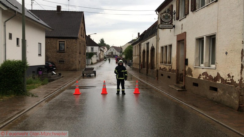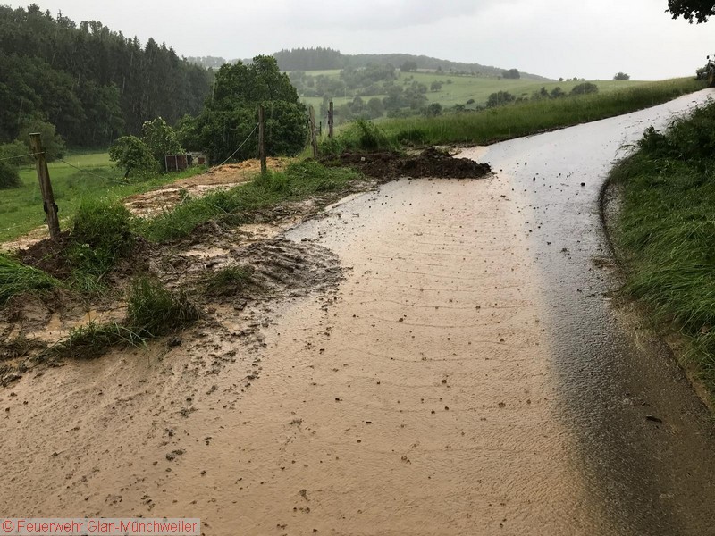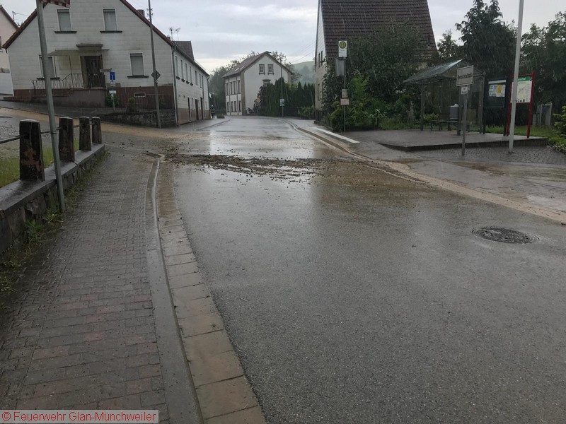 Die Ausrückgemeinschaft Steinbach / Henschtal sowie die IUK-Gruppe der Feuerwehr Glan-Münchweiler wurden zu einer Fahrbahnüberflutung in der Hauptstraße in Henschtal alarmiert. Die Fahrbahn wurde durch einen Landwirt eigenständig mit einem Traktor von Geröll und Schlamm befreit. Für die Dauer der Maßnahmen wurde die Hauptstraße voll gesperrt.
