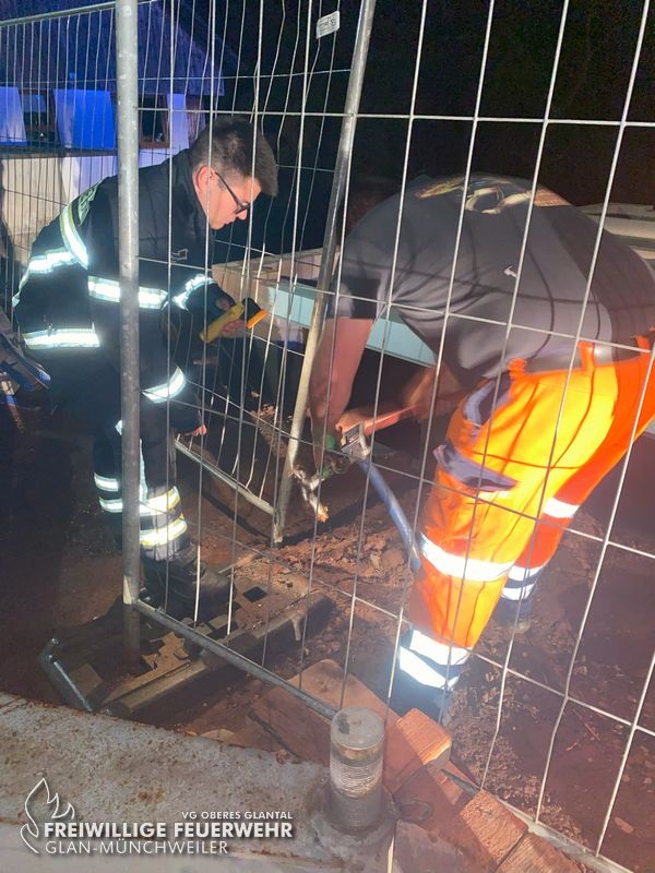 Kurz vor Ankunft der Einsatzkräfte waren die Verbandsgemeindewerke bereits eingetroffen. Im Bereich einer Baustelle für einen Neubau war die Bauwasseruhr abgefallen und das Wasser schoss ungehindert aus der Leitung. Die VG-Werke schieberten umgehend den Anschluss ab und setzten den provisorischen Bauwasseranschluss wieder instand.